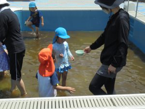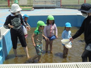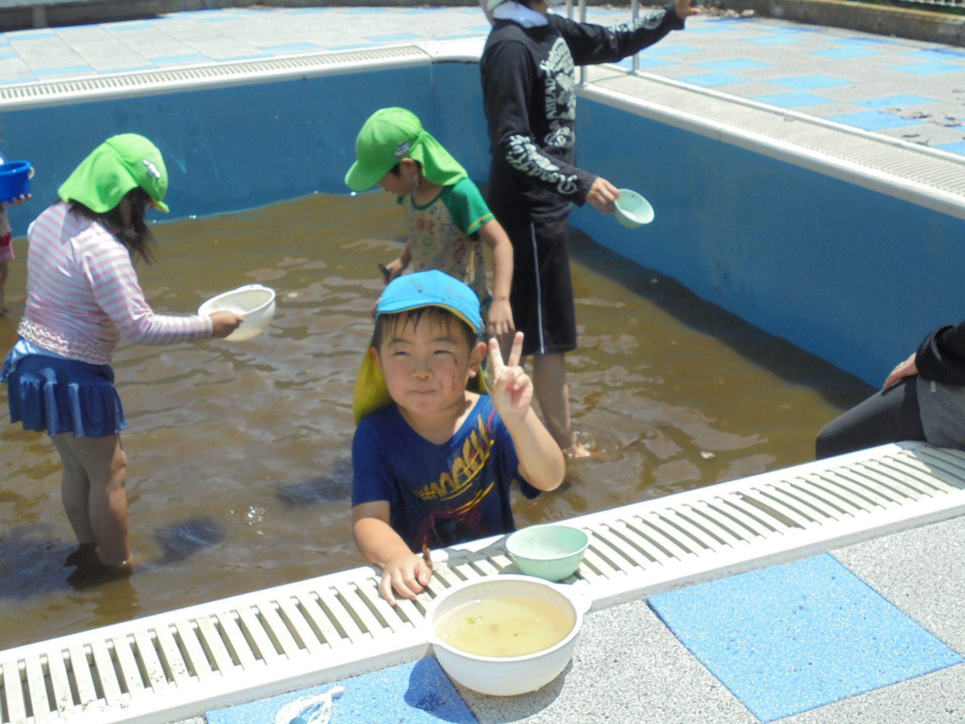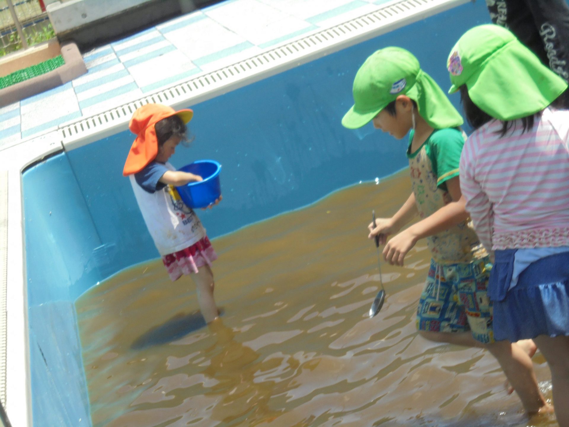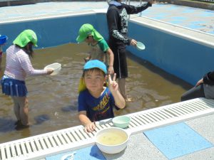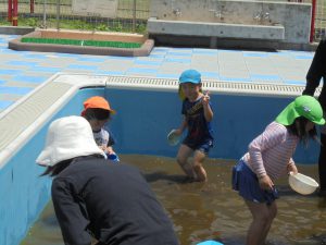 プール掃除の際、プールにいた沢山のオタマジャクシを見つけると「捕まえたい」「飼ってみたい!」と言い、恐る恐るプールの中に入った子どもたち。「ぬるぬるする」「気持ちわる~い」と言いながらもカップやバケツでオタマジャクシを捕まえ、クラスで飼い始めました😊