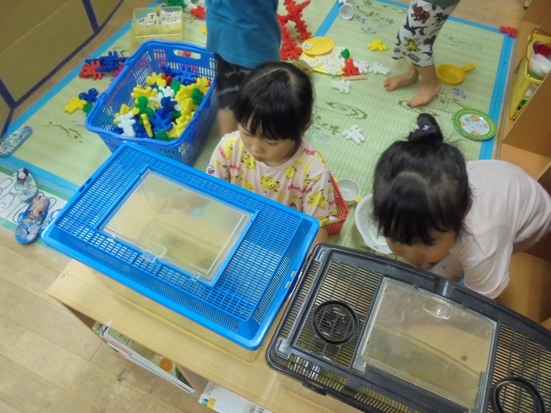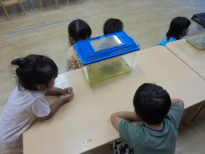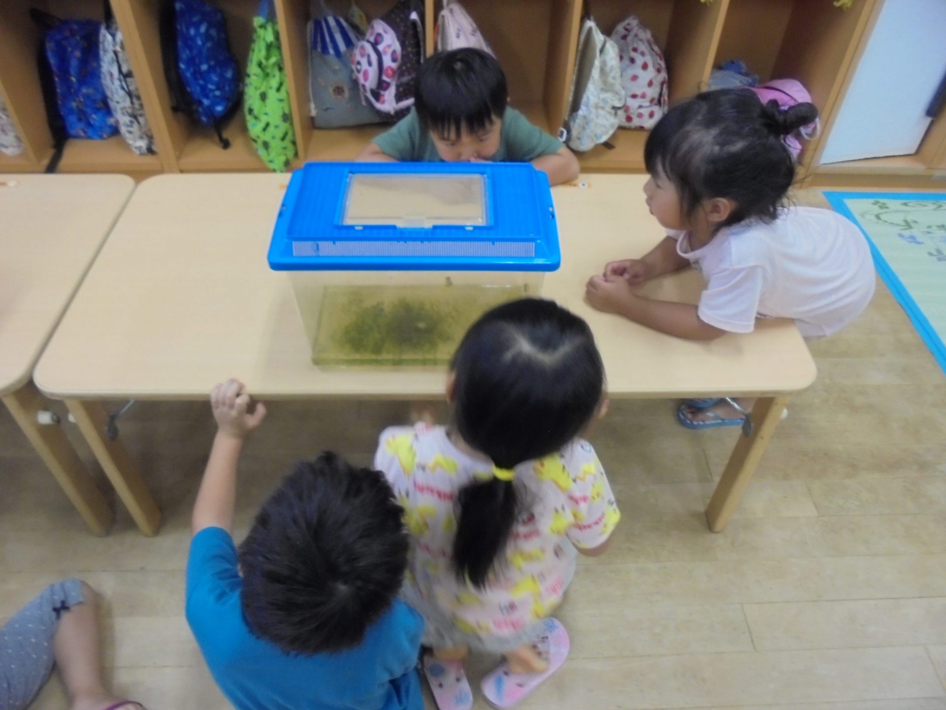 図鑑や本を見ながら、オタマジャクシがカエルになることや水槽に石が必要なことを知りみんなで飼育しました。オタマジャクシに足が生えると「もう少しでカエルになりそう!!」と毎日観察を楽しんでいました。