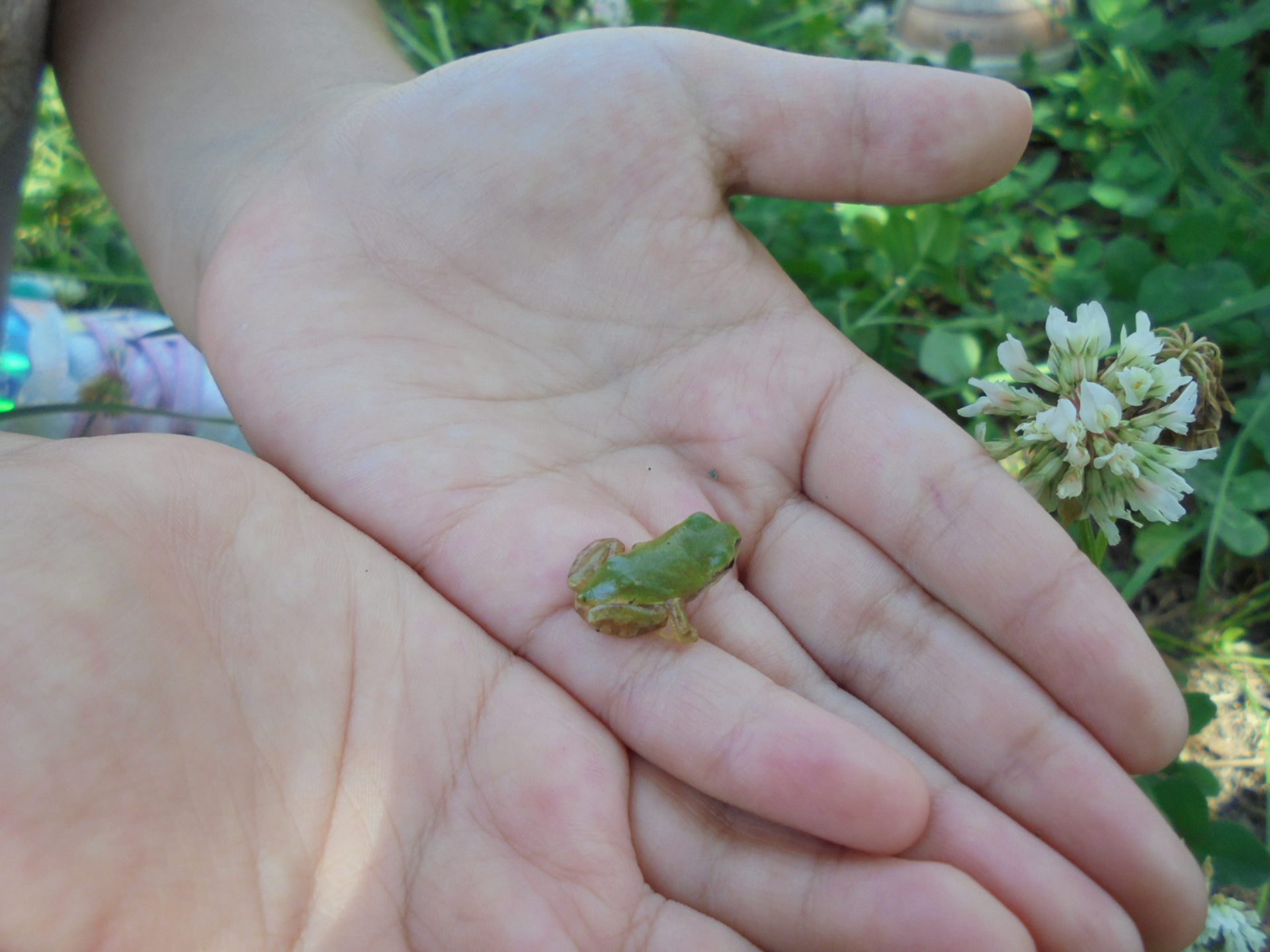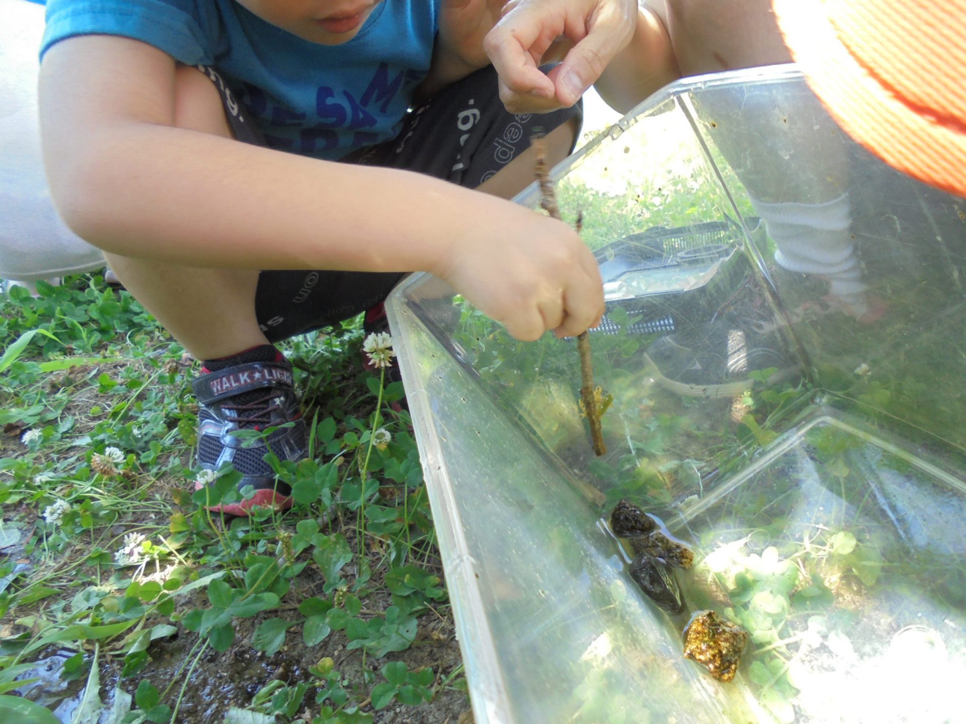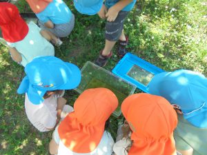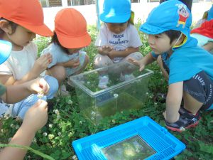 ほとんどのオタマジャクシがカエルになると「逃がしてあげよう!」という意見があがり、クラスみんなで園庭の草むらに逃がすことに!水槽をよじ登るカエルを応援したり、草を使ってお手伝いしてあげたりしました。「カエルさんばいばい」「カエルさんも悲しいのかな…」と別れを惜しんでいた子どもたちです。