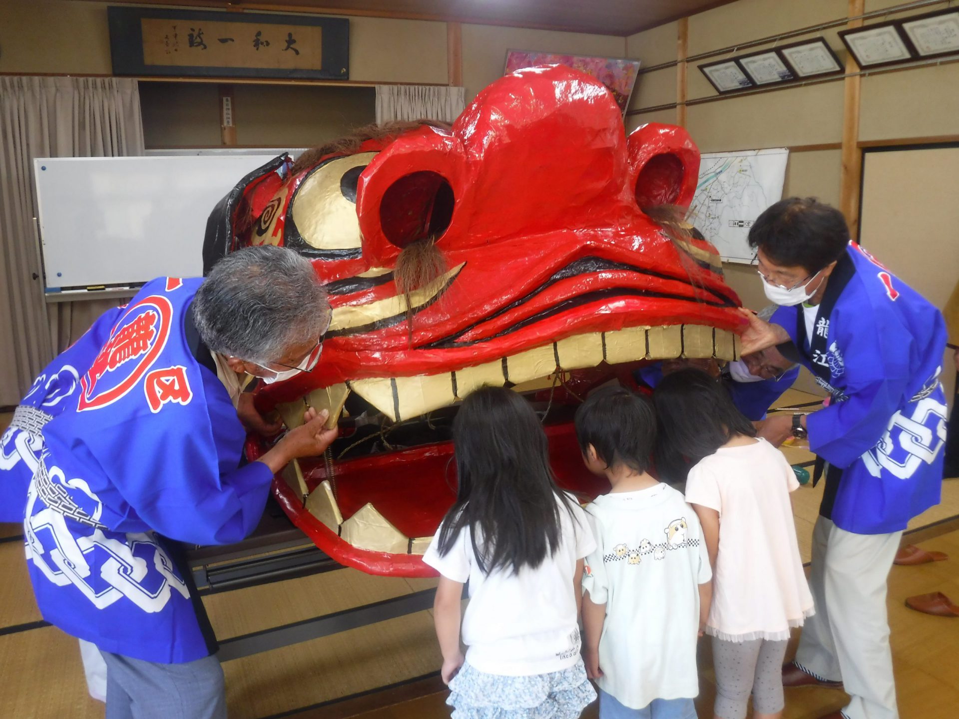 「どうやってお獅子を作ったの?」「竹を組んで作ったんだよ。口の部分は牛乳パックを使っているんだ。」