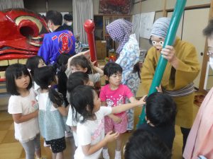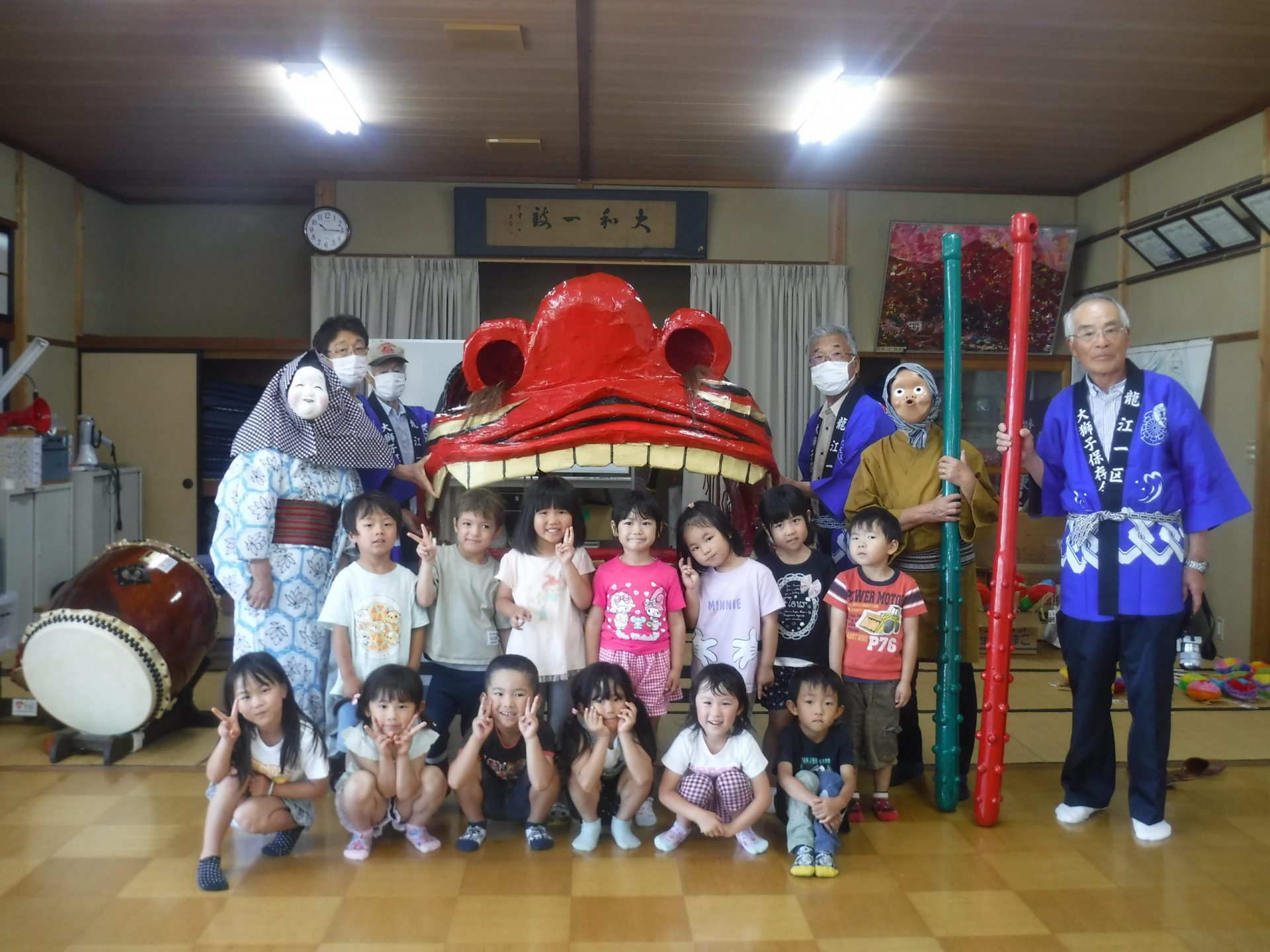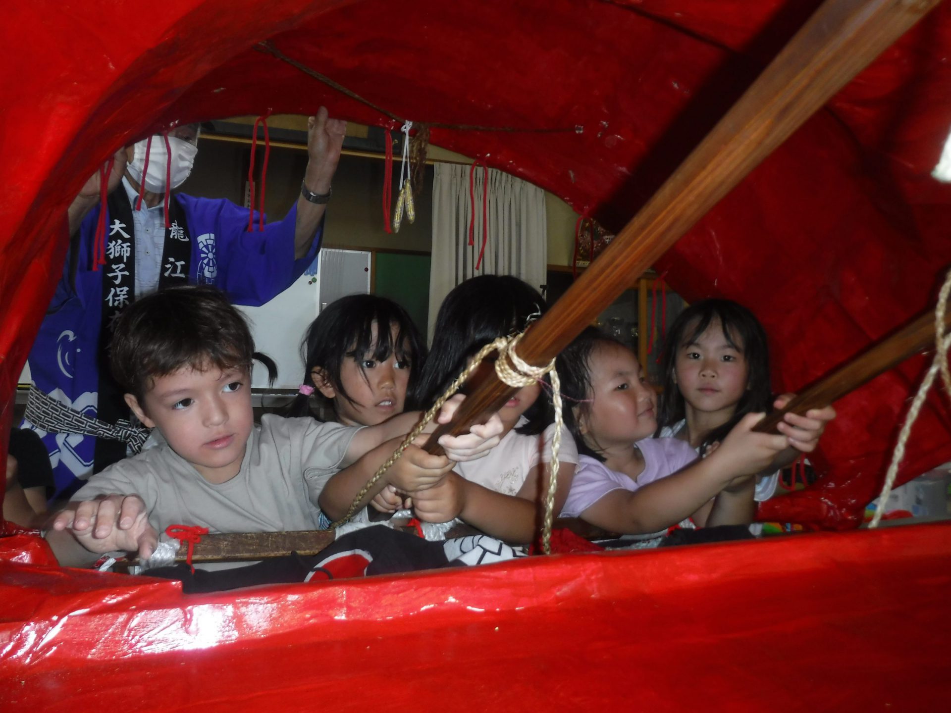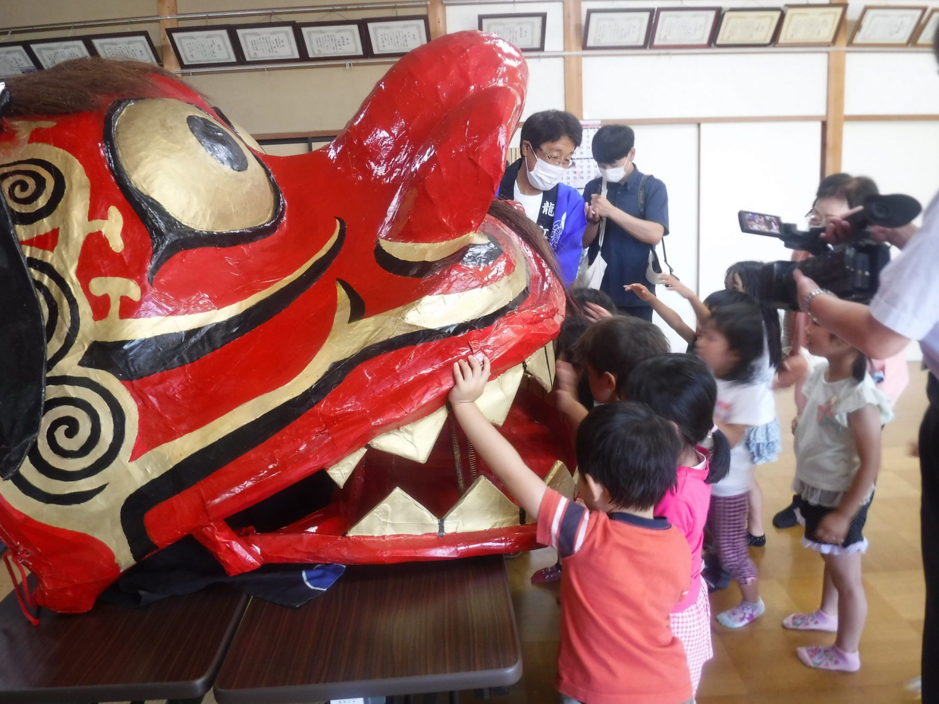 ・お獅子が好きで遊びの中にも取り入れ、自分たちでもお獅子を作ってみていたが、実際のお獅子を見て違いも感じ、また新たにより実物に近いものにしたいという意欲もでてきた。保存会の方々が子ども達の為にお獅子に触れさせてくださったりお囃子を聞かせてくださったりしたことで、これからの遊びにもつながっていくのではないかと思う。