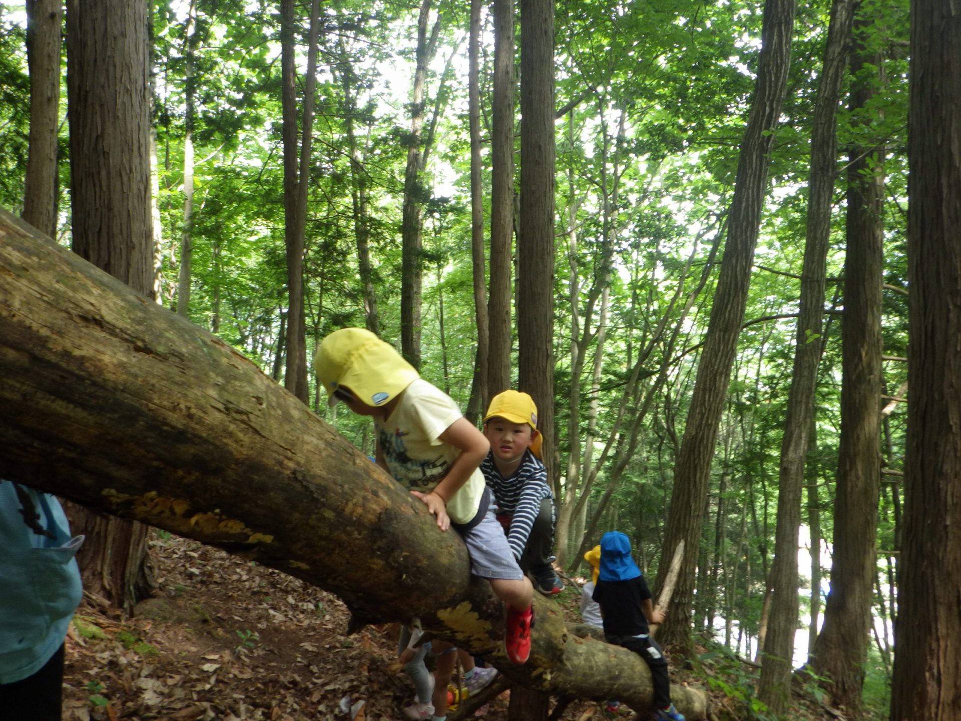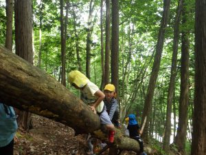倒木を登ったあとは滑り降りていきます。ちょっとドキドキしながら足を踏ん張ったり、お尻をつけたり、近くにある木や枝につかまってみたりしています。