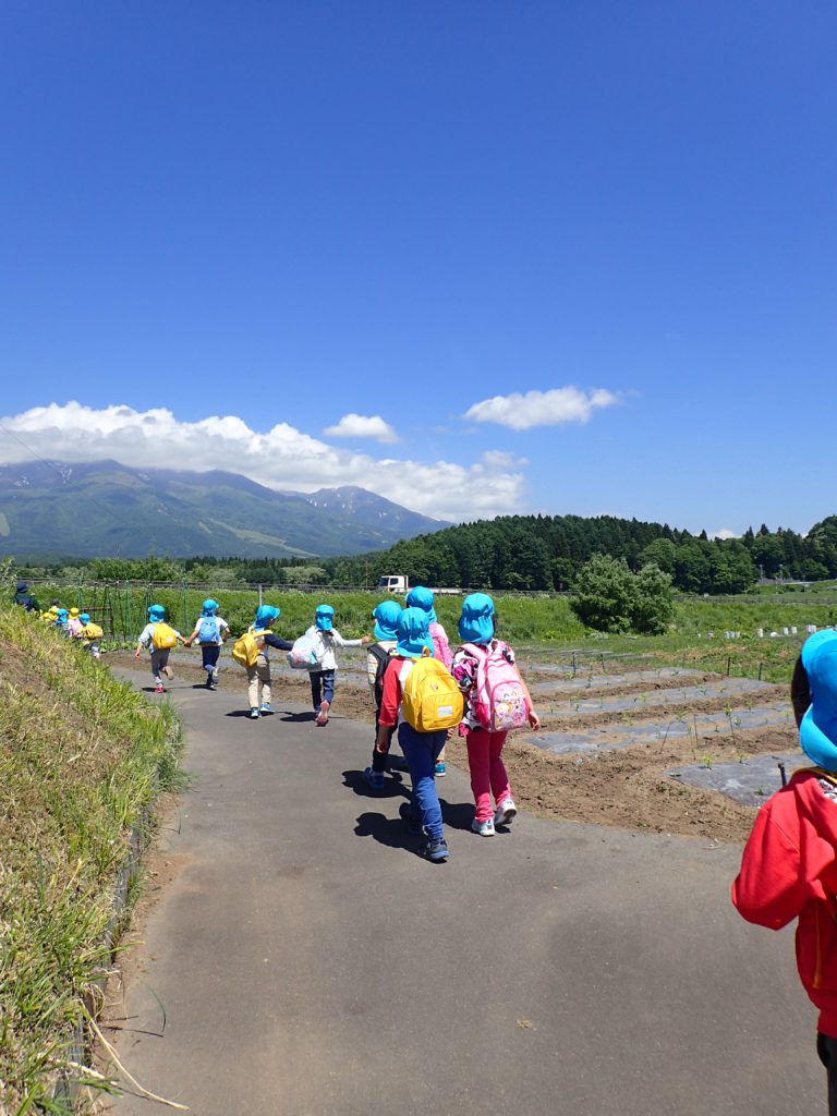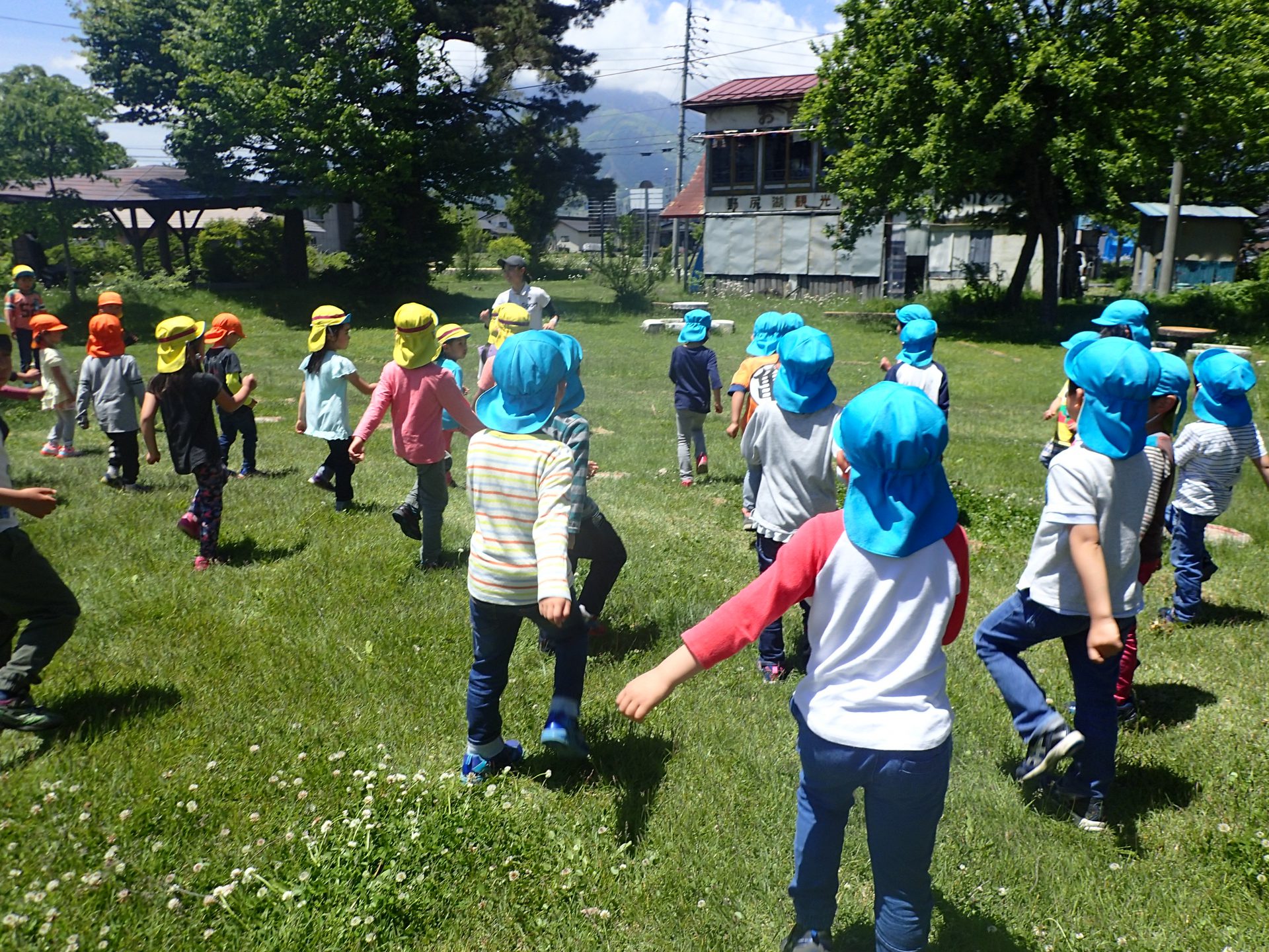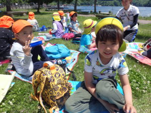 青空で気持ちの良い風の中、信濃町にある4園の保育園が集まりナウマンゾウ博物館、野尻湖にある水戸口公園で交流会がありました。