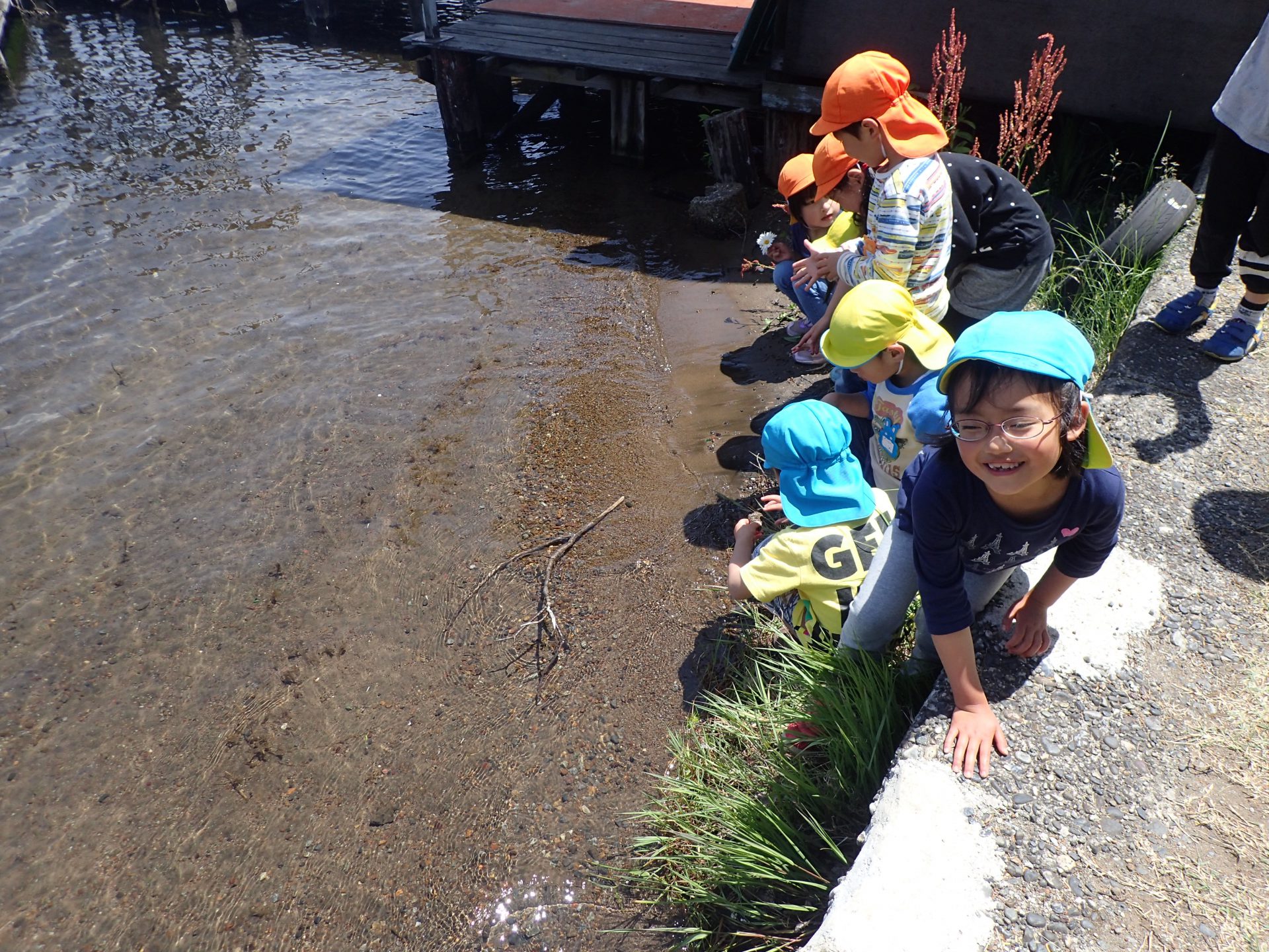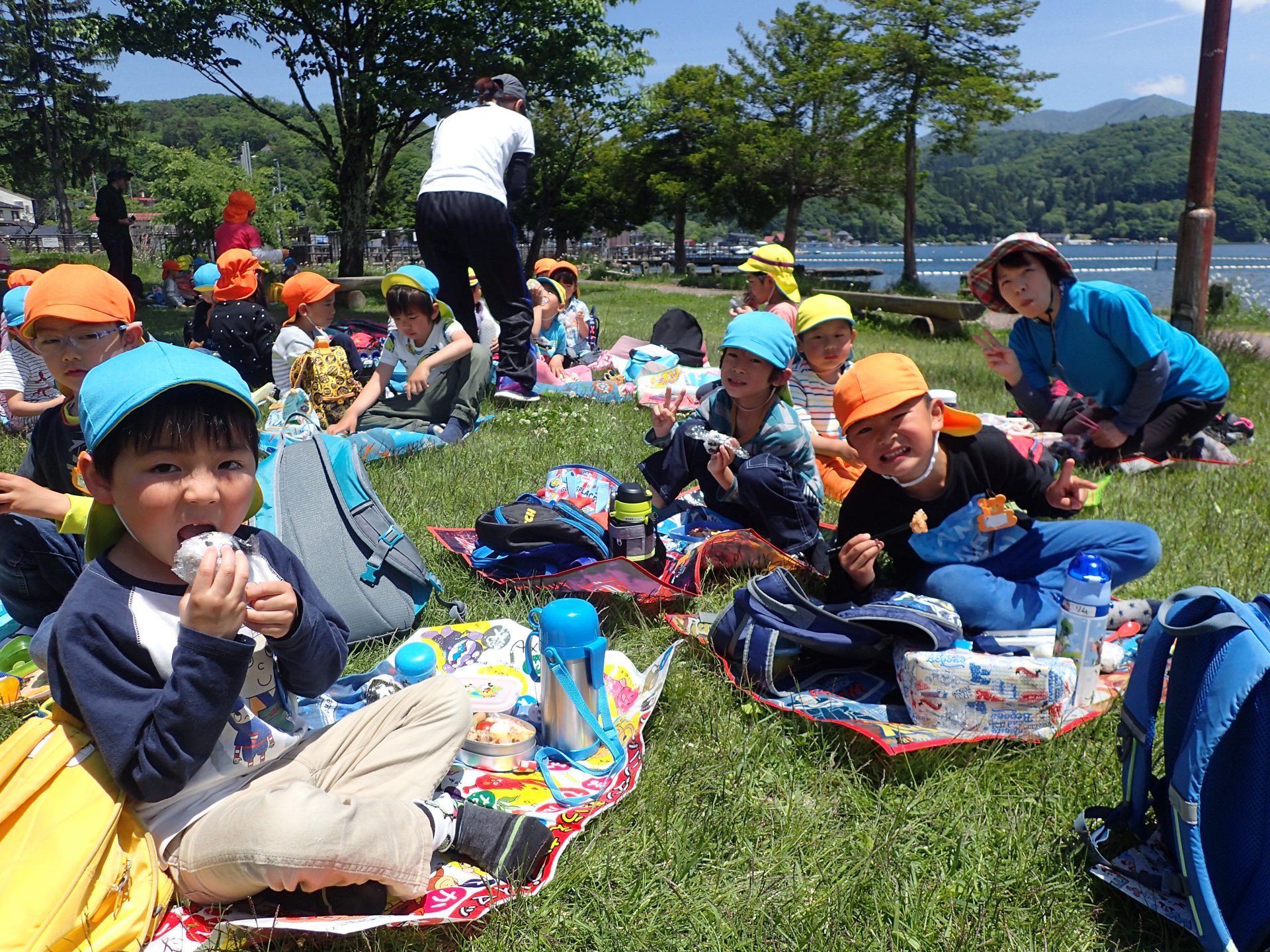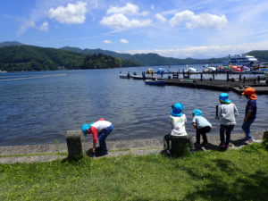 食後は、目の前に広がるキラキラした野尻湖を見たり、水を触ってみたりと他の保育園のお友達と遊びました。