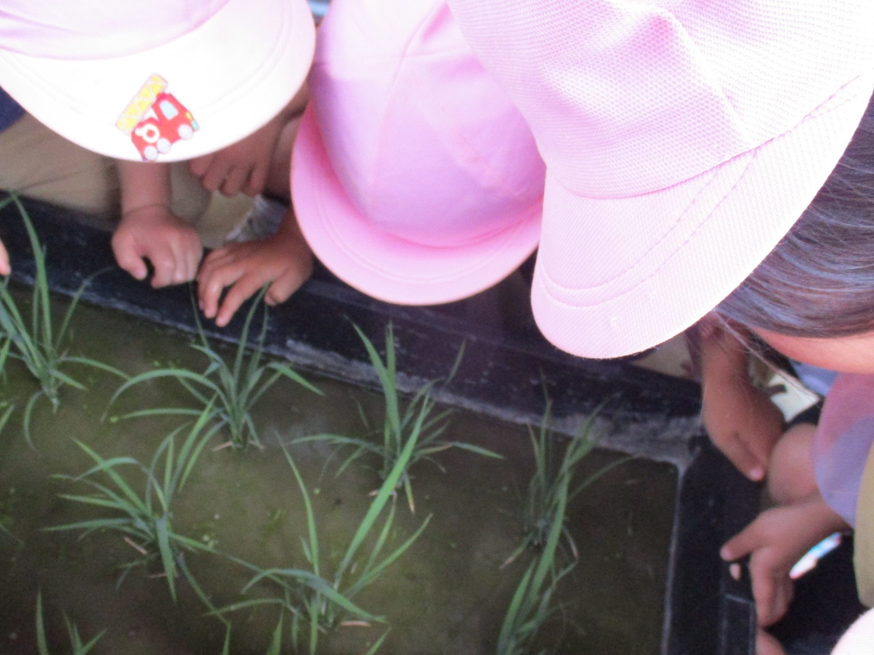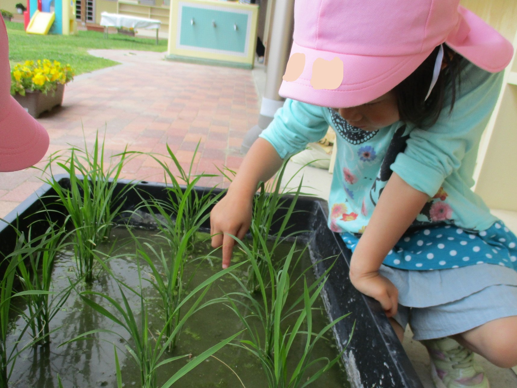 「そういえば、園のミニ田んぼにおたまじゃくしいないね〜」と話していたころ、お友だちがお家の近くで捕まえたおたまじゃくしを持ってきてくれました。