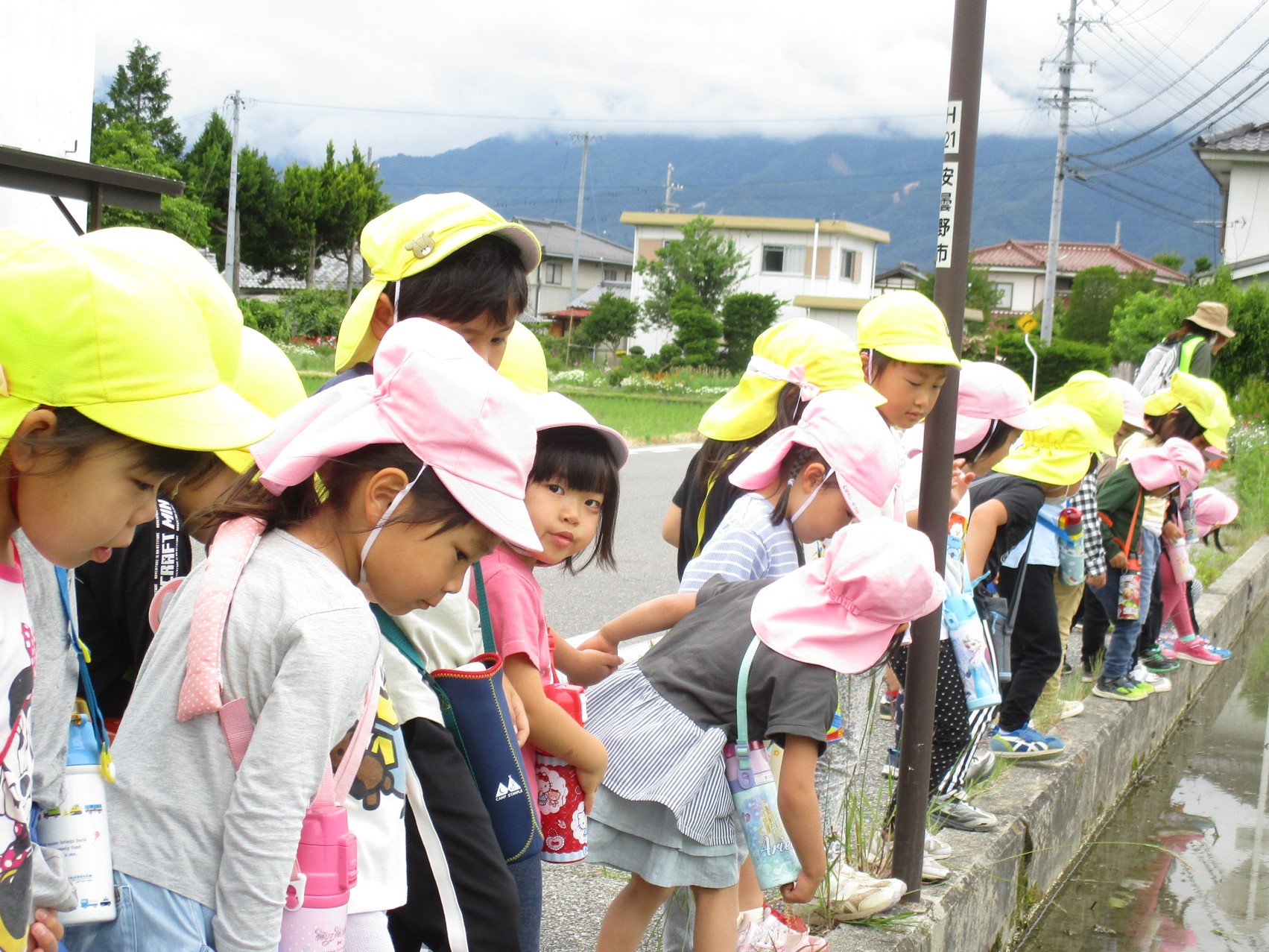 ある晴れた日、年長さんとお散歩に出かけ、途中の田んぼにたくさんのおたまじゃくしを見つけました。