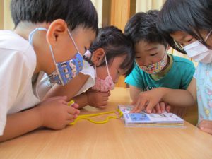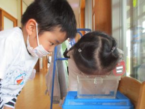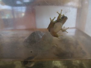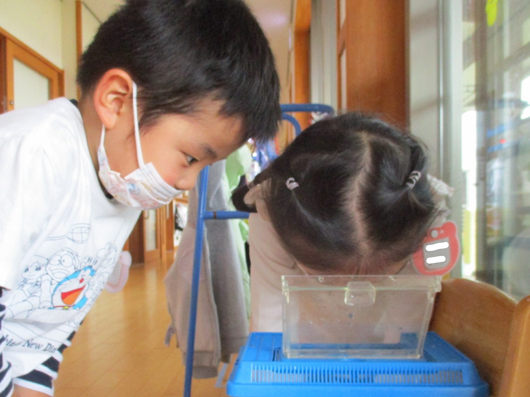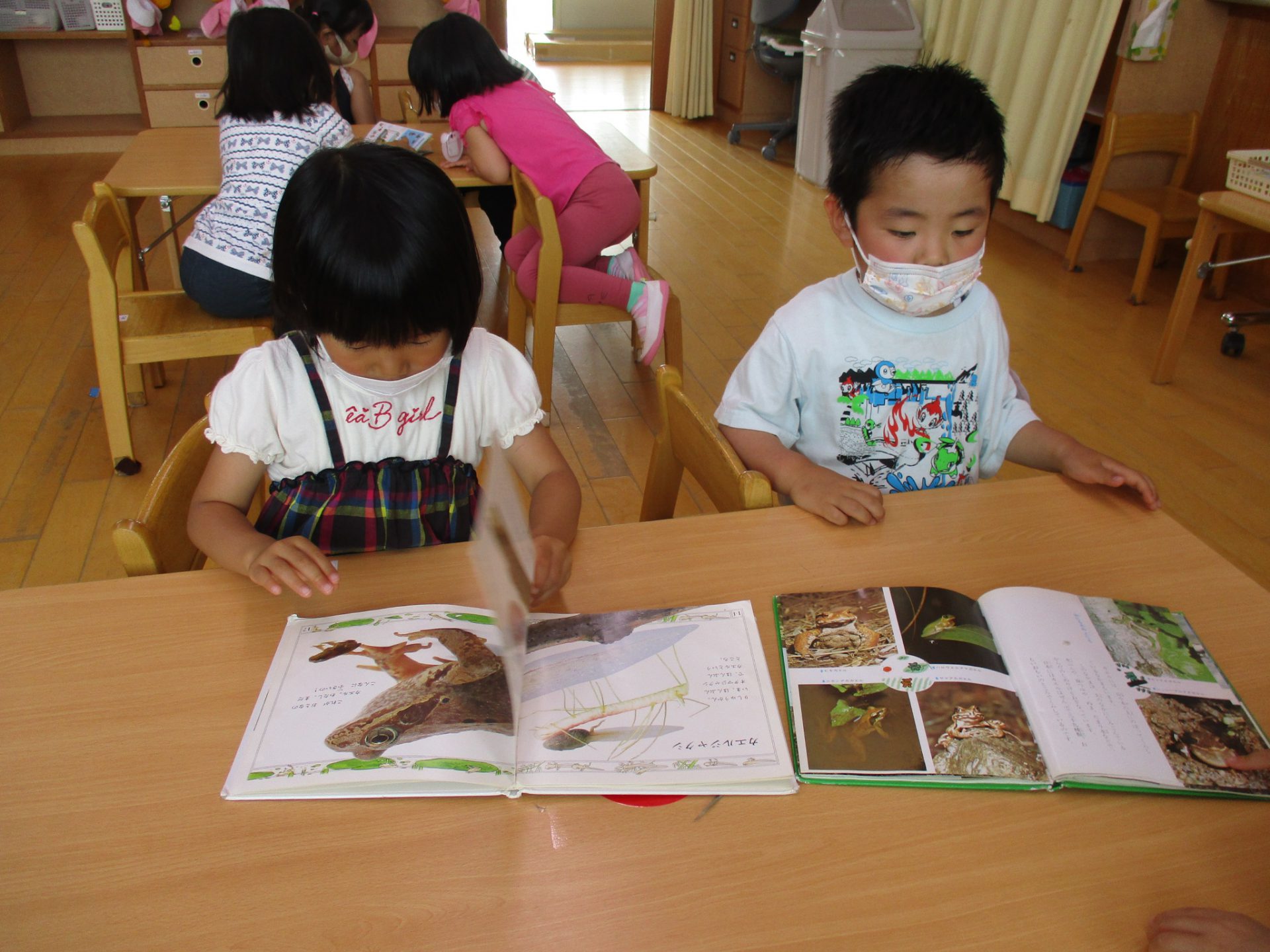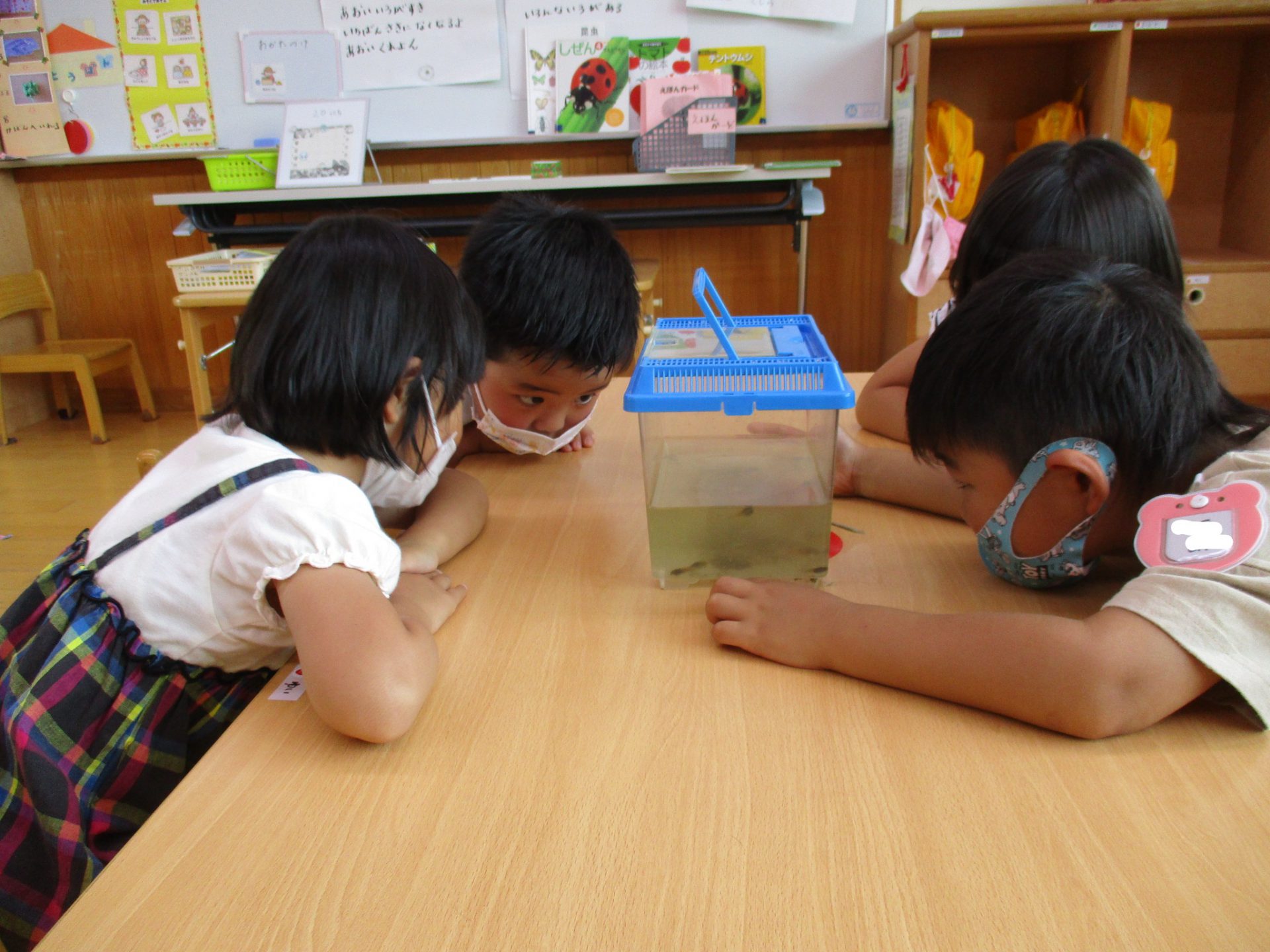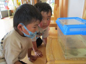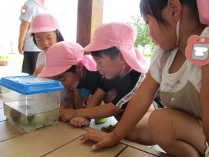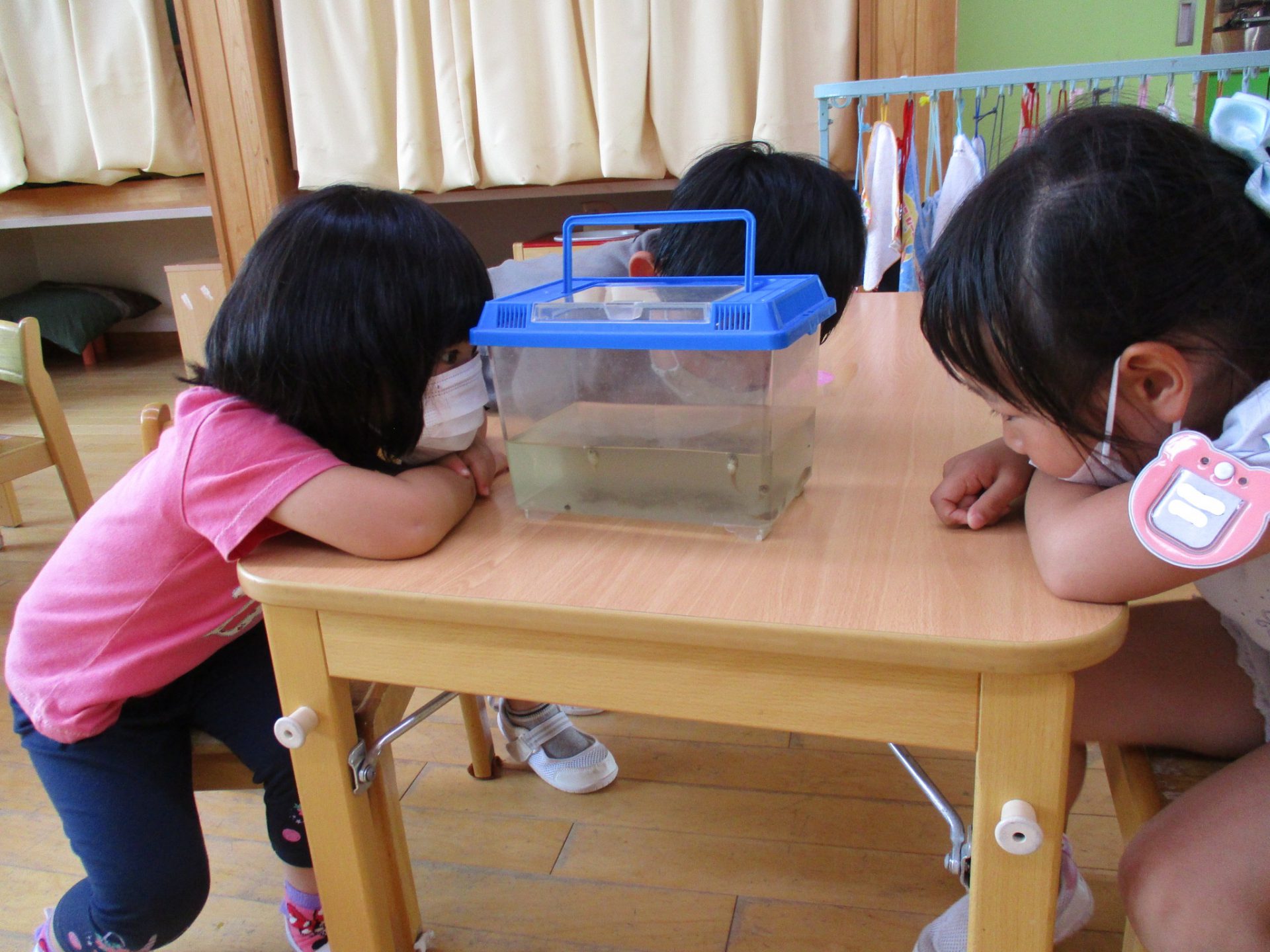 ・小さなおたまじゃくしに足が生え、手が生えカエルに変化していく様子が子どもたちにはとても興味深かったようですです。