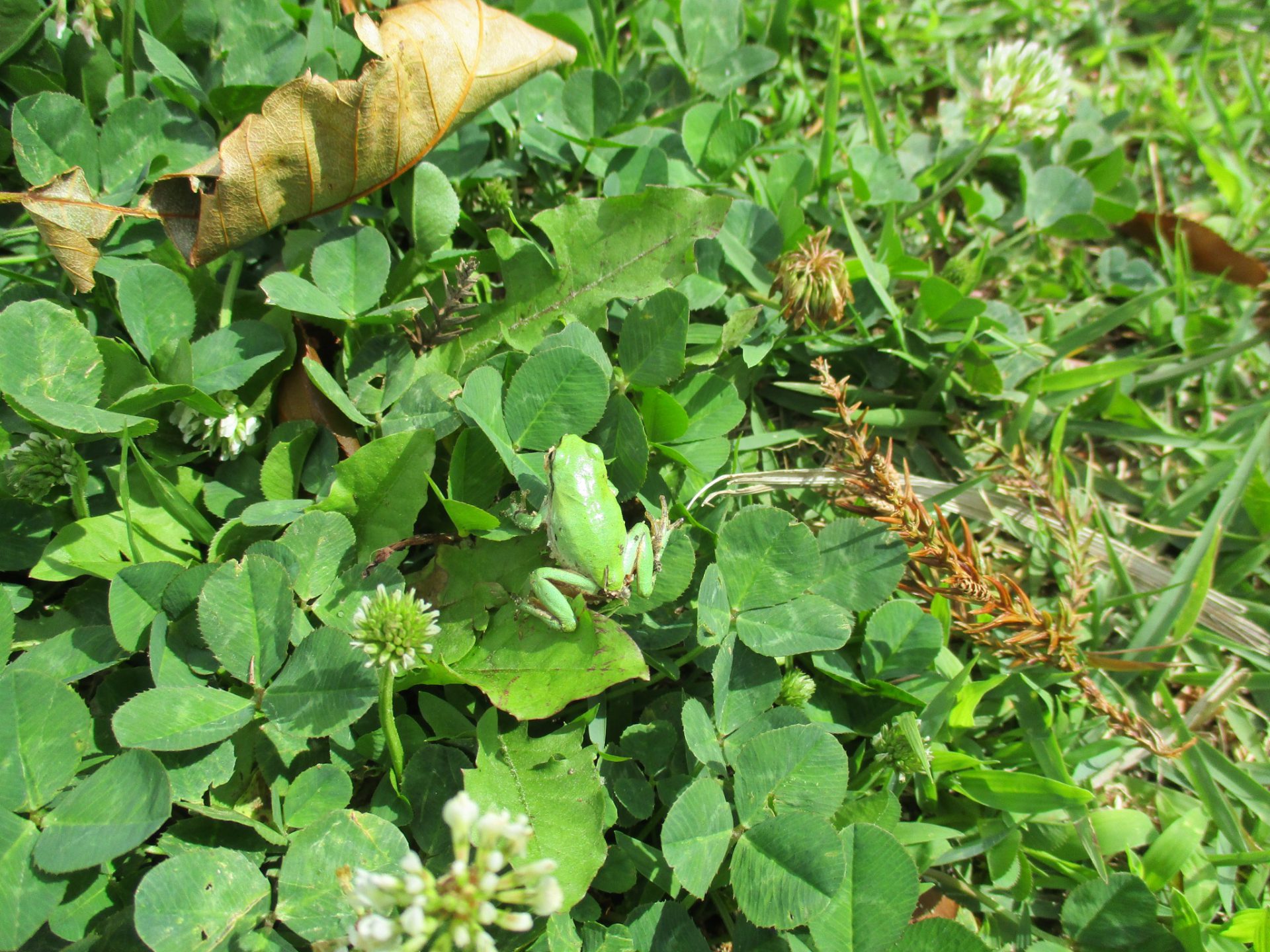 子どもたちが逃したカエルは小さな田んぼではもの足りずすぐに庭のクローバー畑へ出かけていきました。