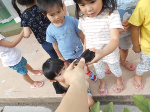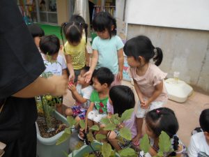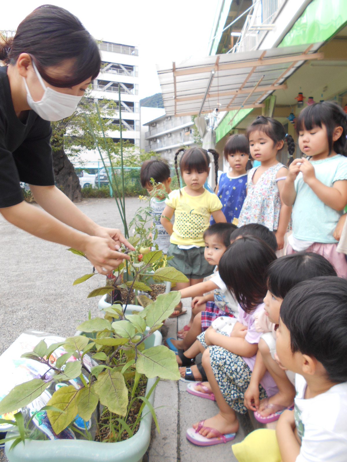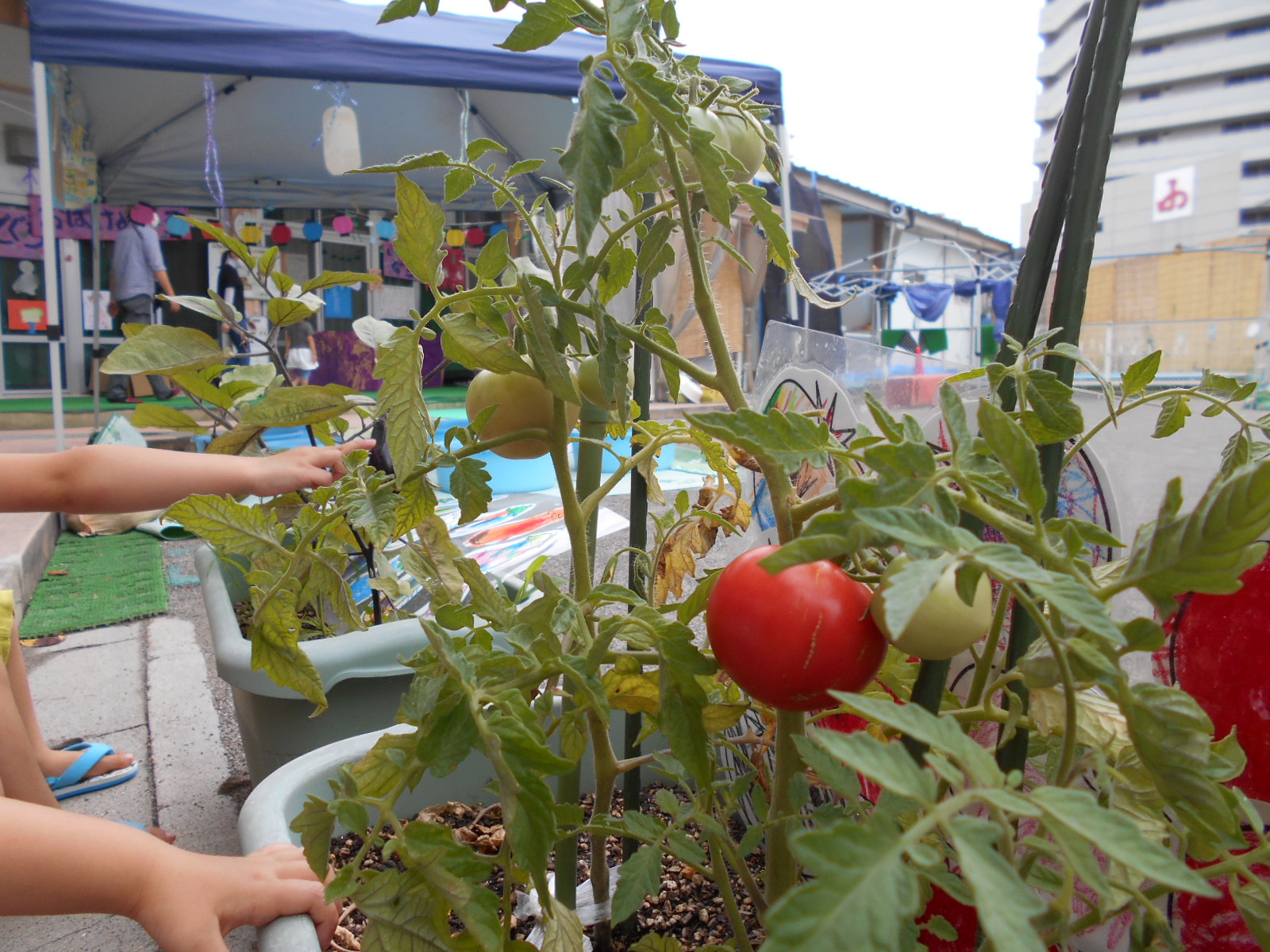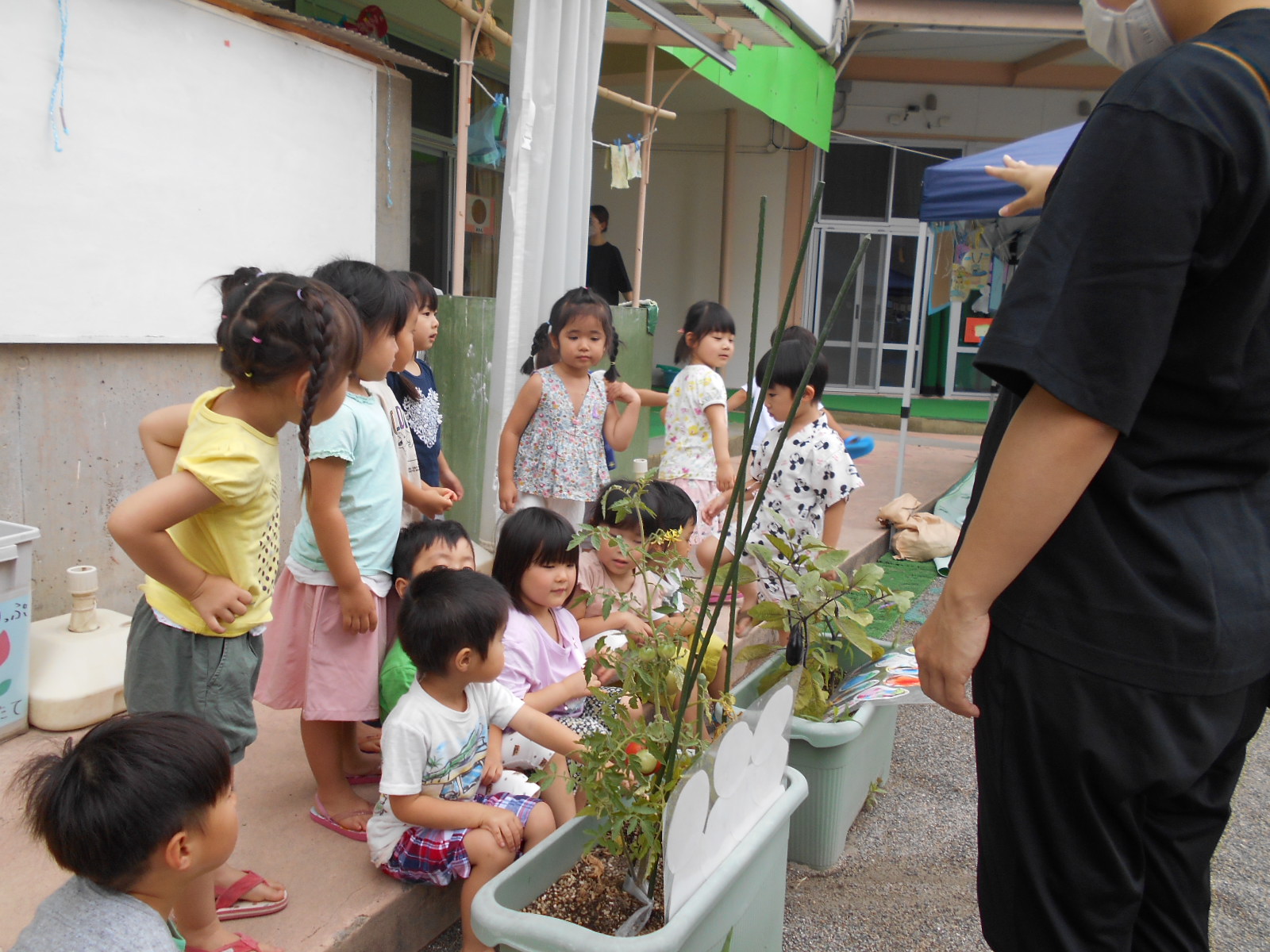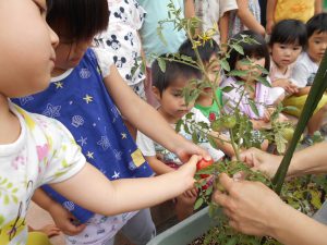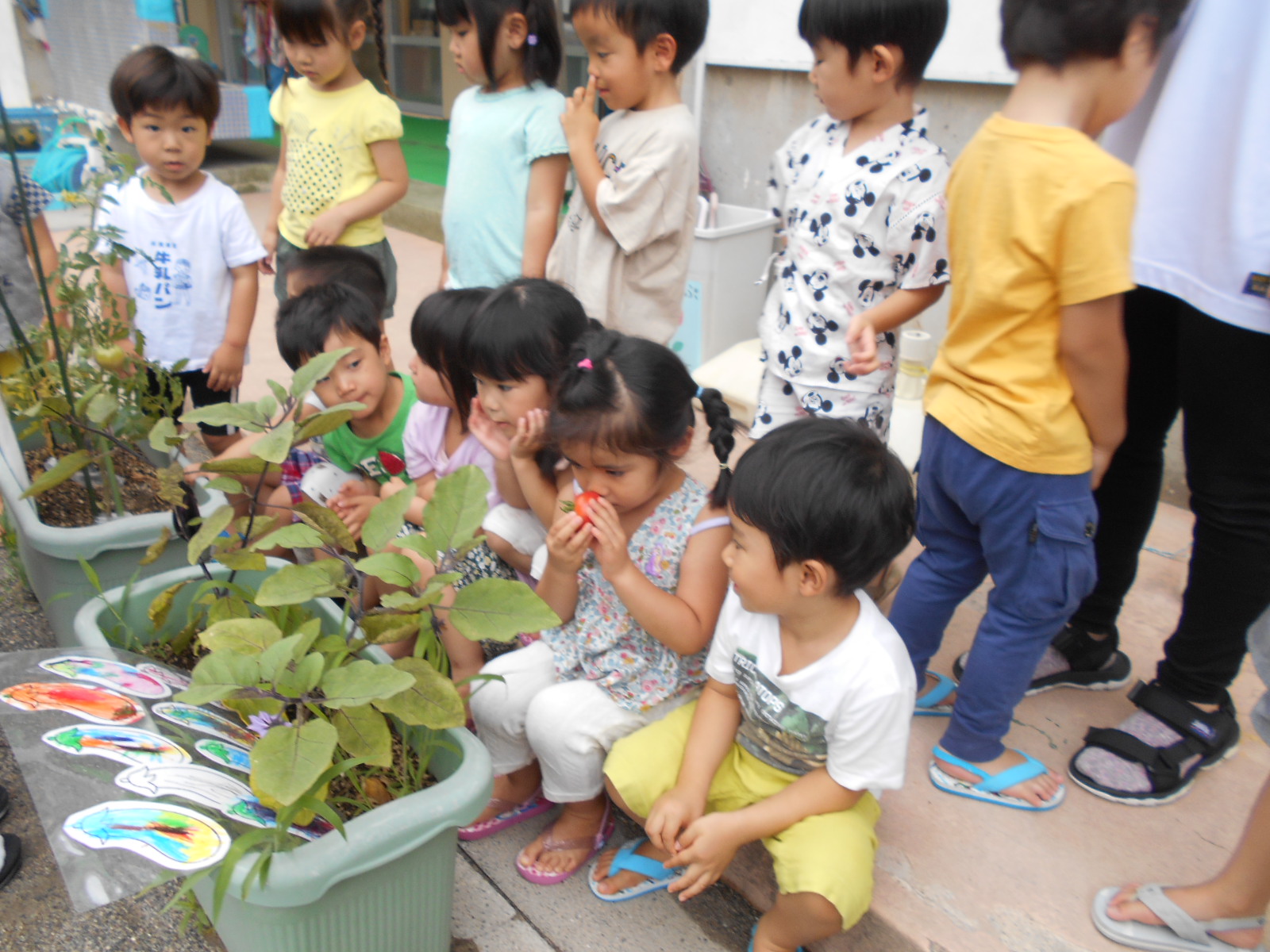5月に植えたトマトとナスが大きくなったのでみんなで収穫をしました♪