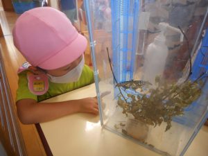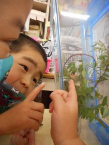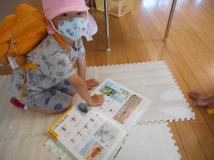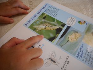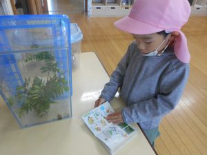 初めて幼虫を見る子も多く、「なんの幼虫だろう?」と興味を持った子どもたちは図鑑や絵本を持ち出して調べ始めました。