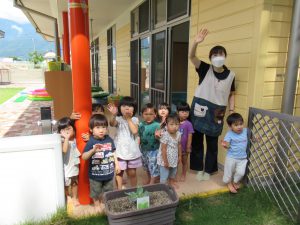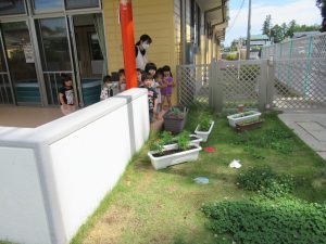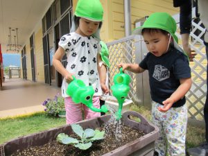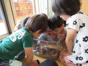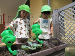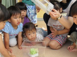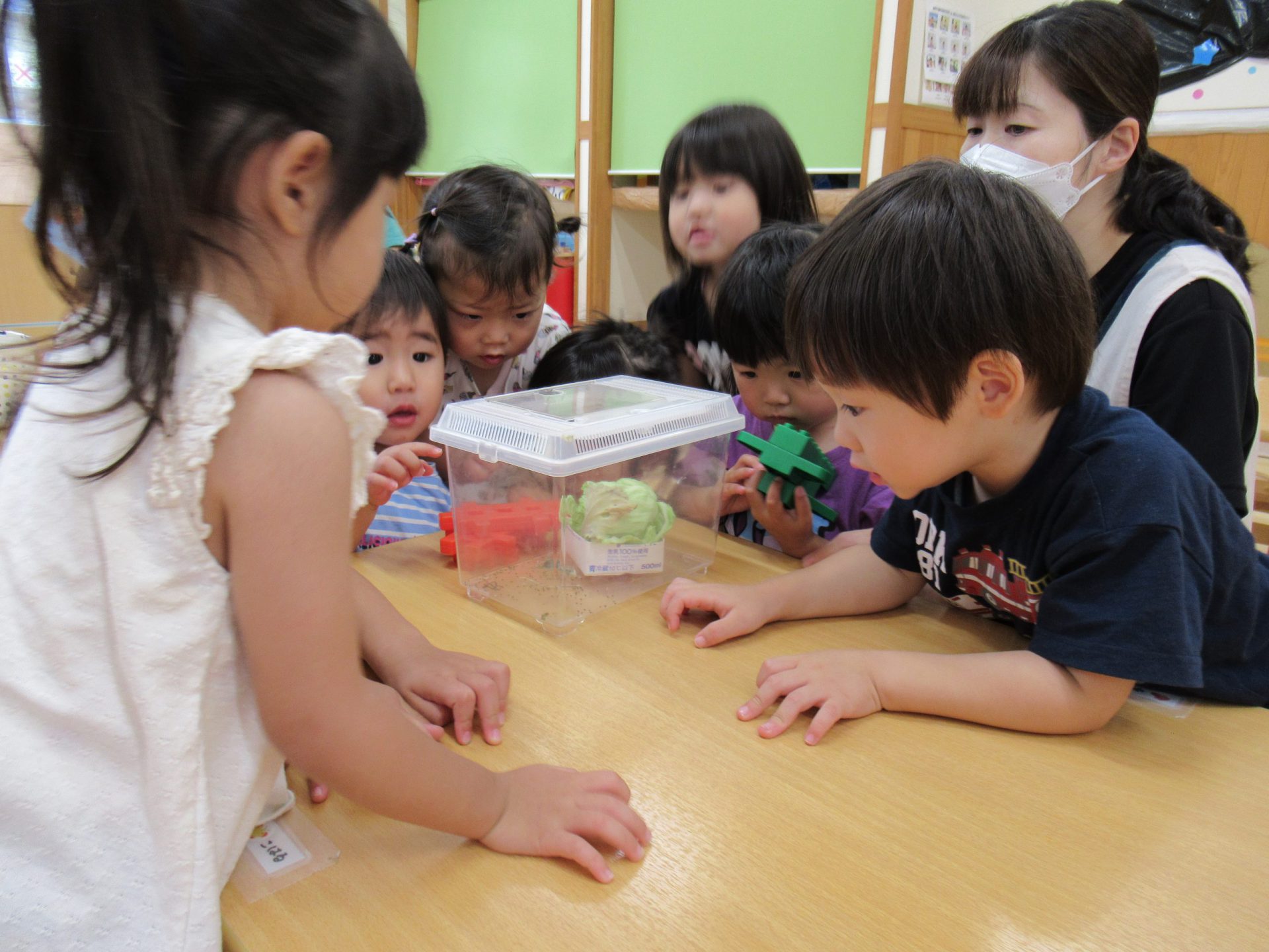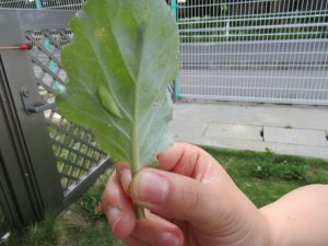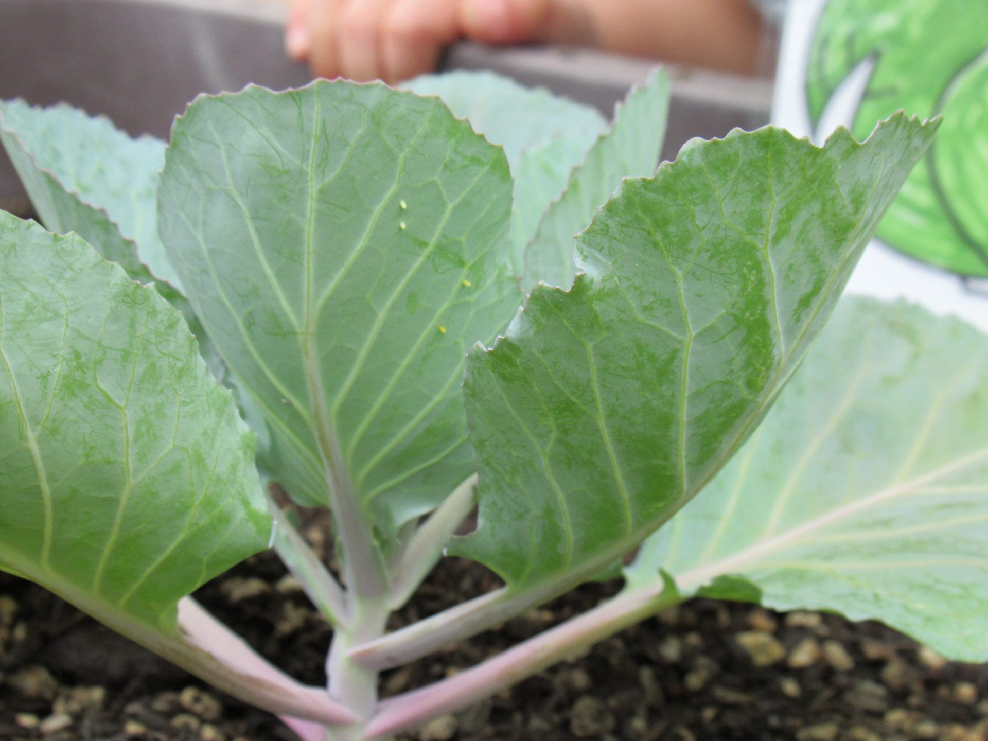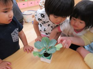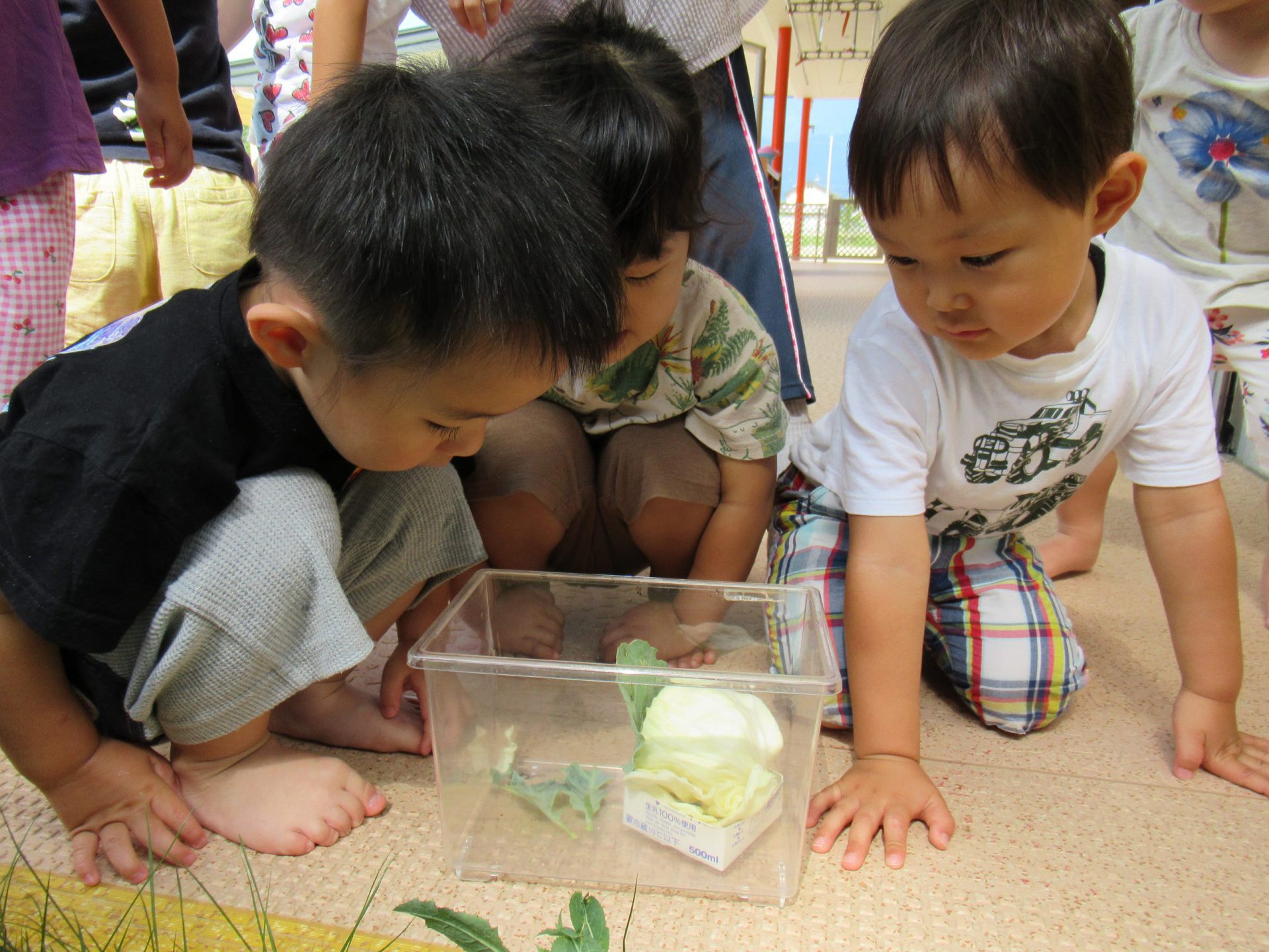 様々な虫や生き物を見たり触れたりして自然に親しんでいければと思いキャベツ・あおむしの生長を観察してきました。