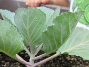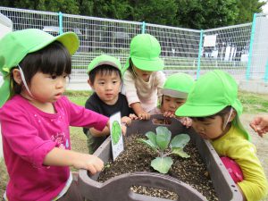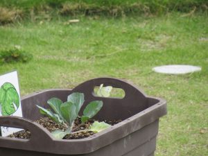 「キャベツの苗だよ。」と教えてもらい、キャベツの苗を植えました。