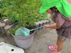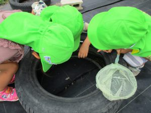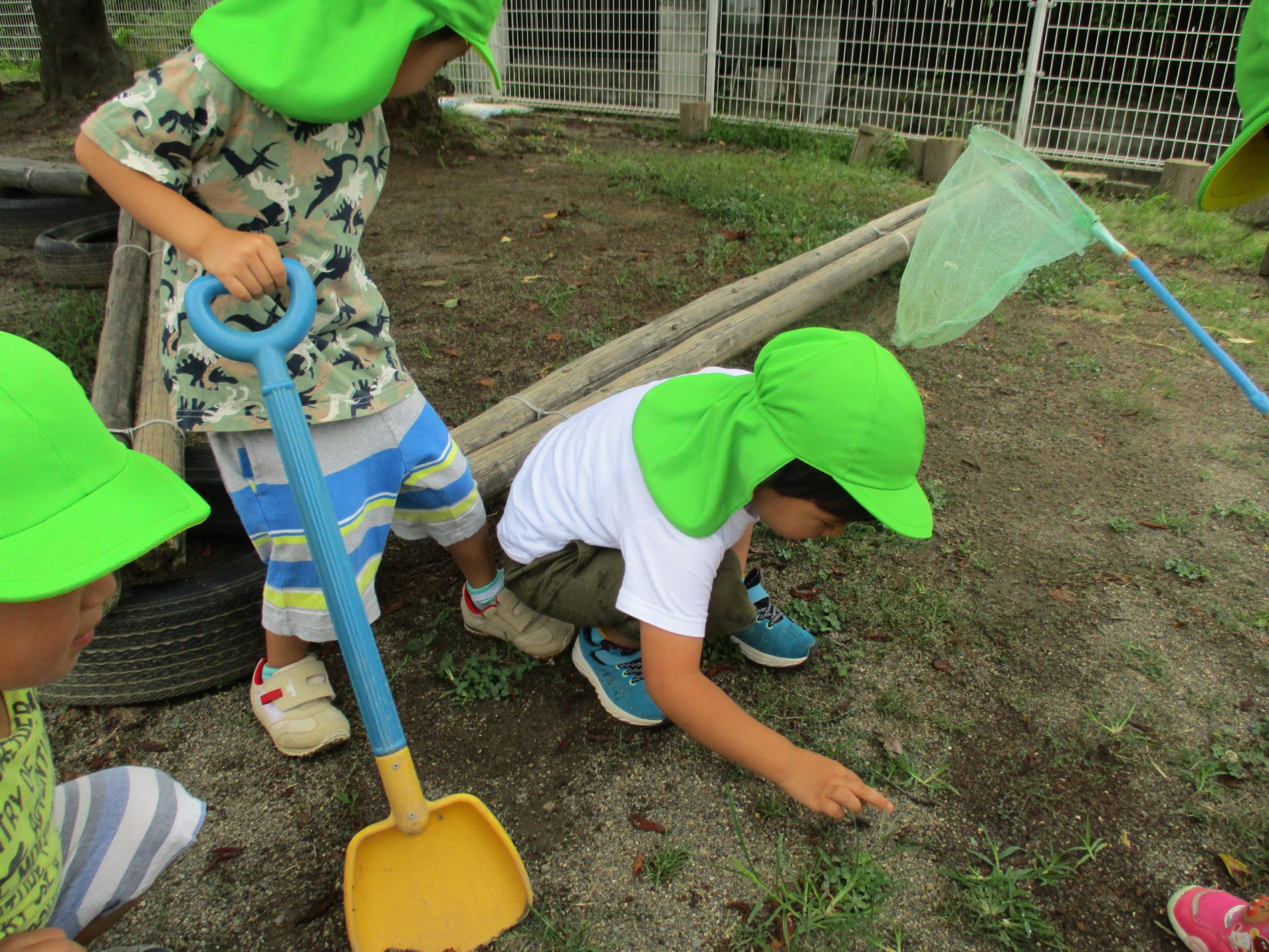 ・子どもたち自身が虫がいそうな場所を探していました。こんなところに!という場所をいい目で見つけていました。見つけると友達にすぐに教えて一緒に捕まえることを楽しんでいました。