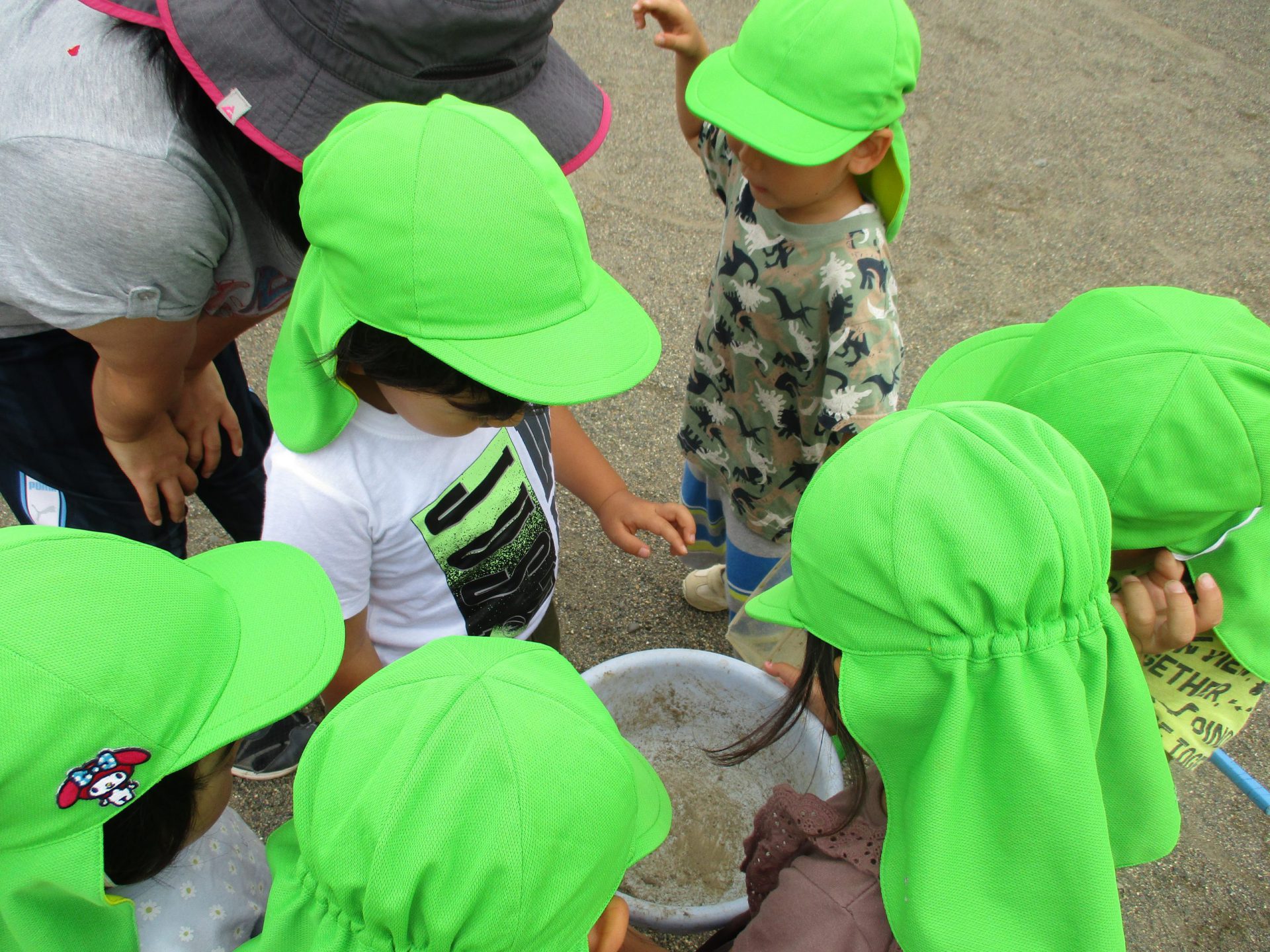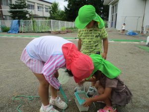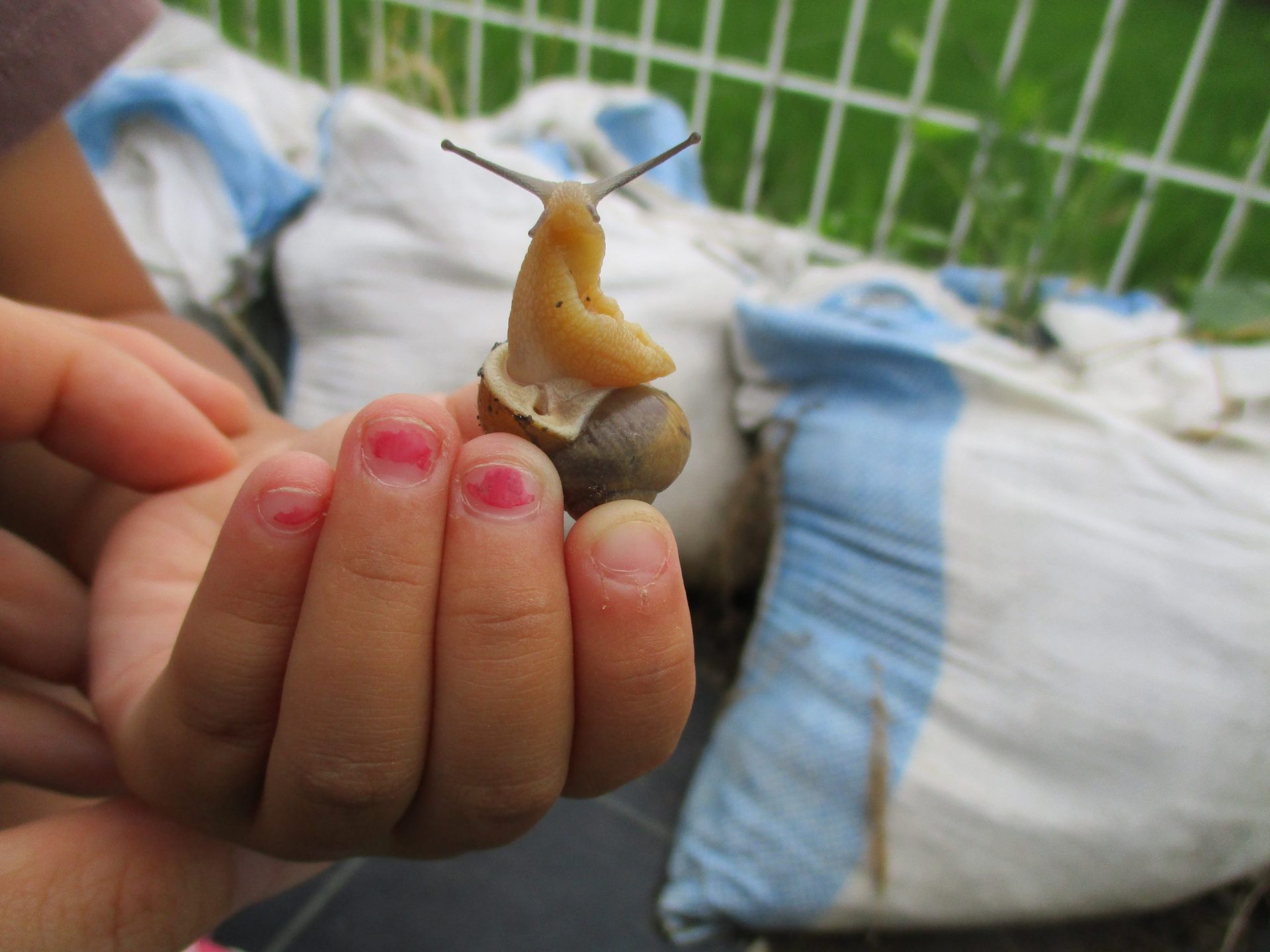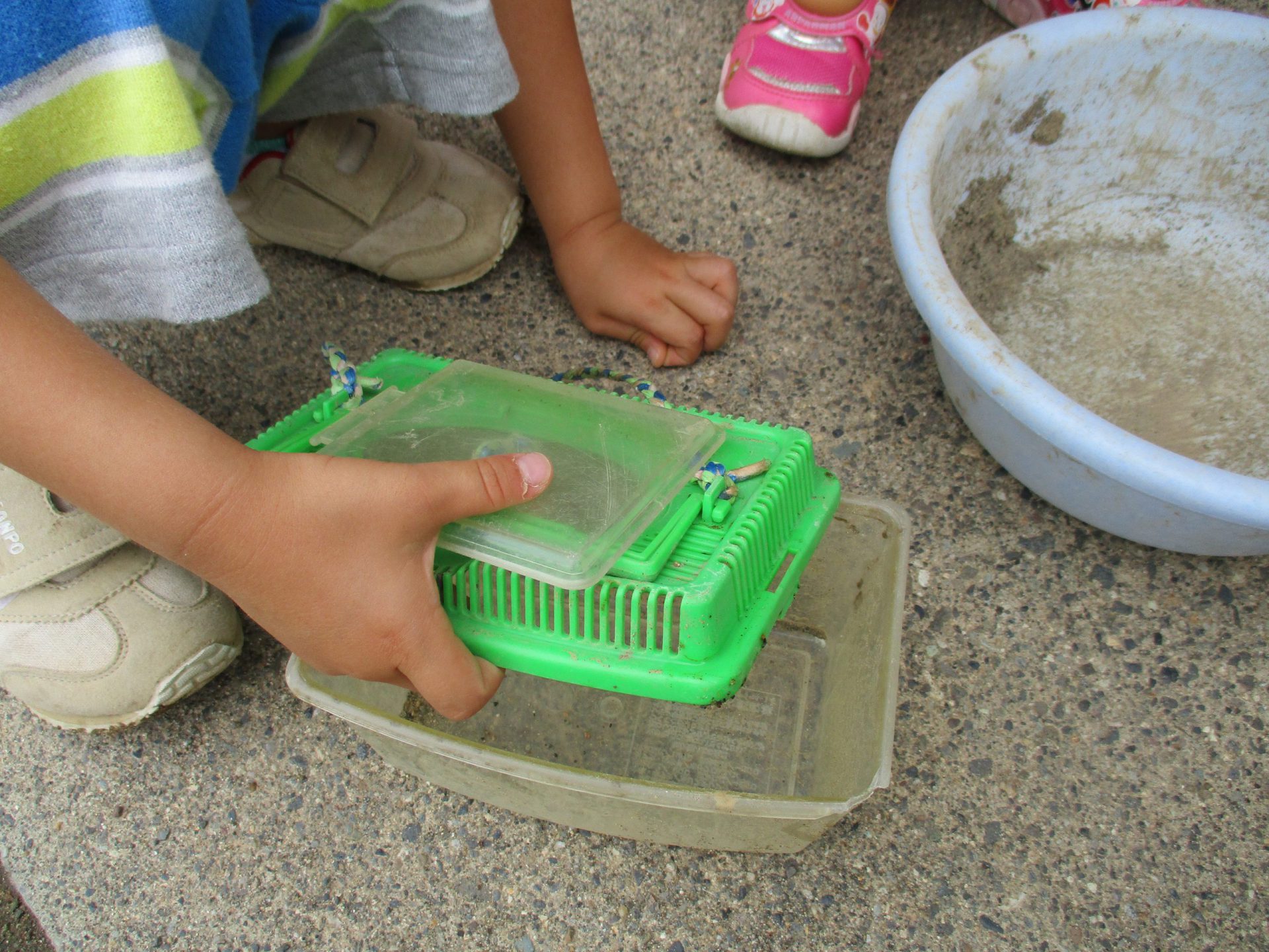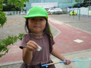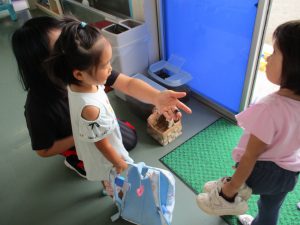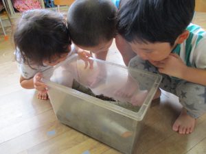・虫探しを重ねるごとに虫の扱いが上手になってきました。捕まえるときはそーっと。捕まえたものは虫が苦しくないように、みんなで見れるように虫かごに入れるなどができるようになりました。虫探しや、カブトムシの飼育を通して、少しずつ命の大切さを伝えていきたいと思います。