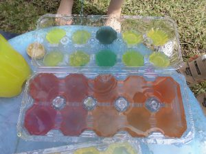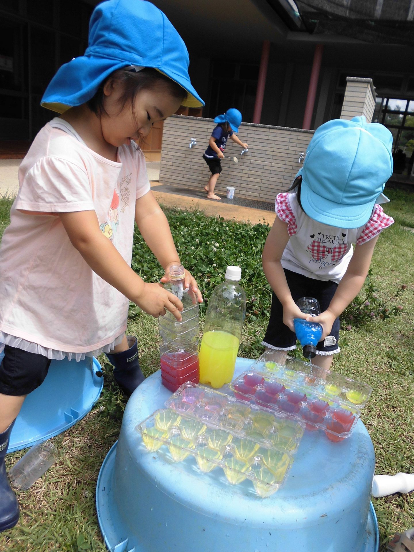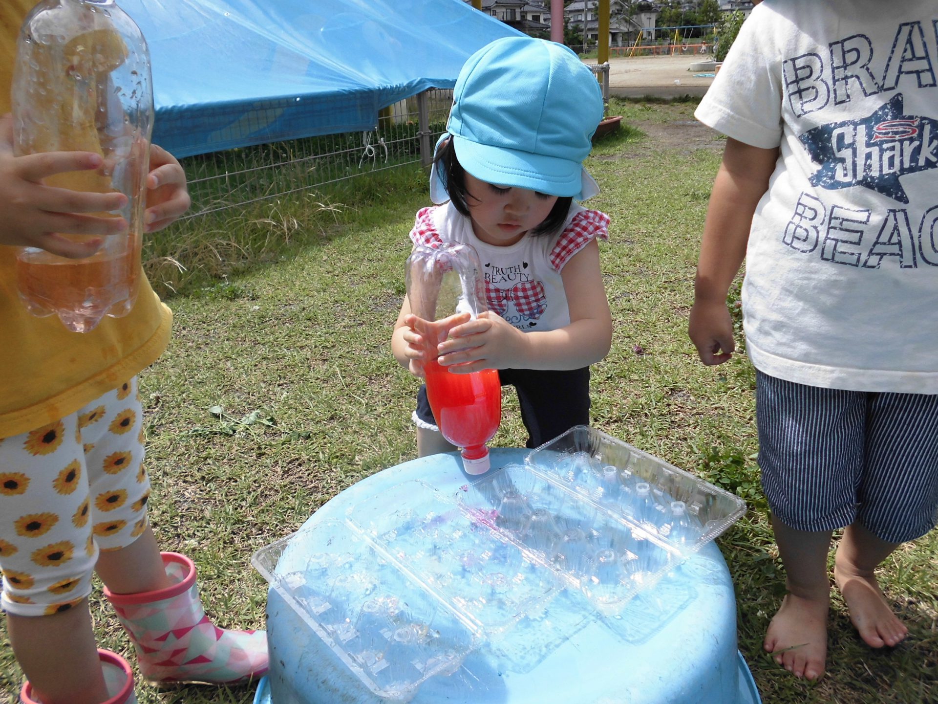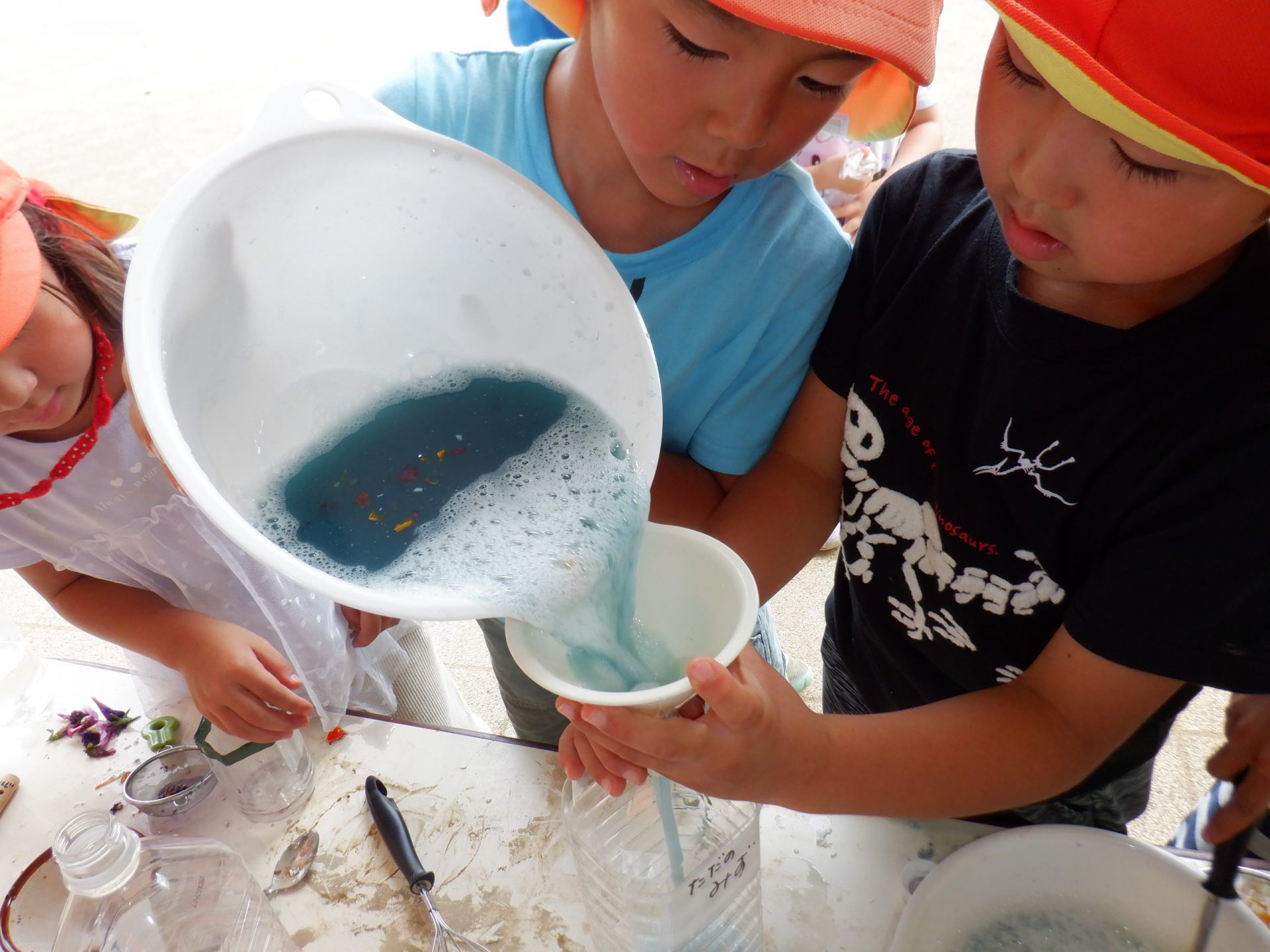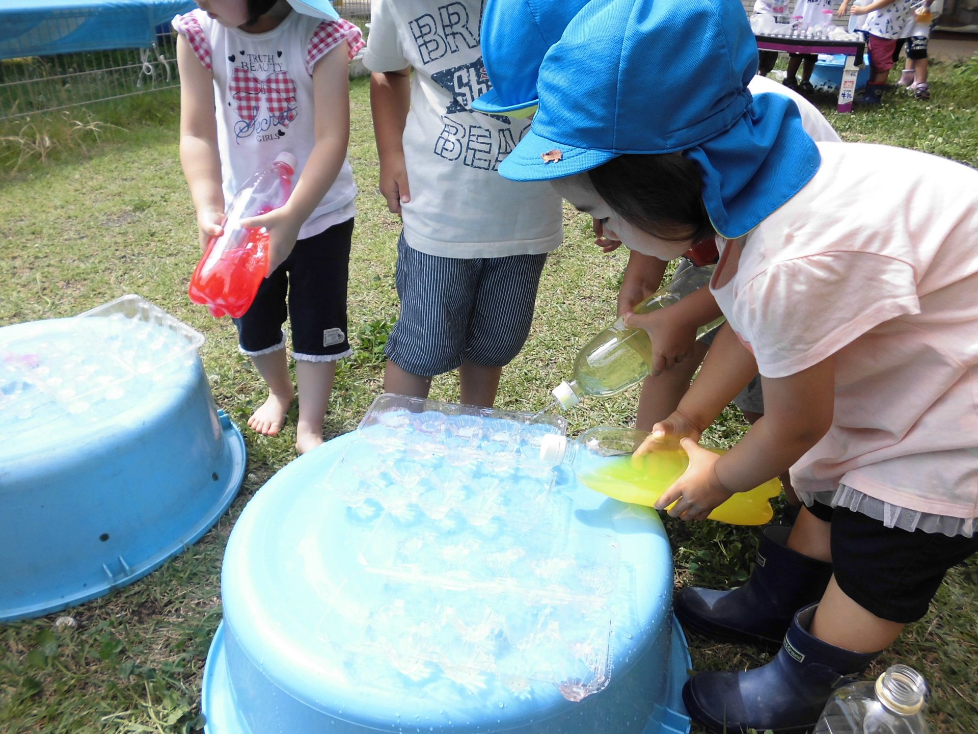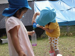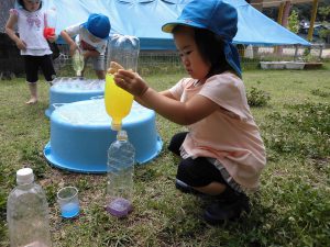 年長さんは“魔法の粉”を色水にいれて色を変えたり、泡を作ったりして遊んでいます。