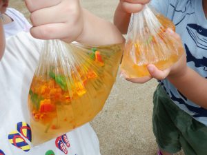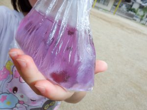 夏の暑さの中、水に触れ、気持ちよさを感じながら色が出たり、変化する様子を見て楽しみました。