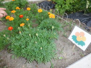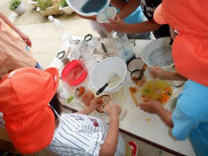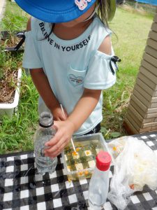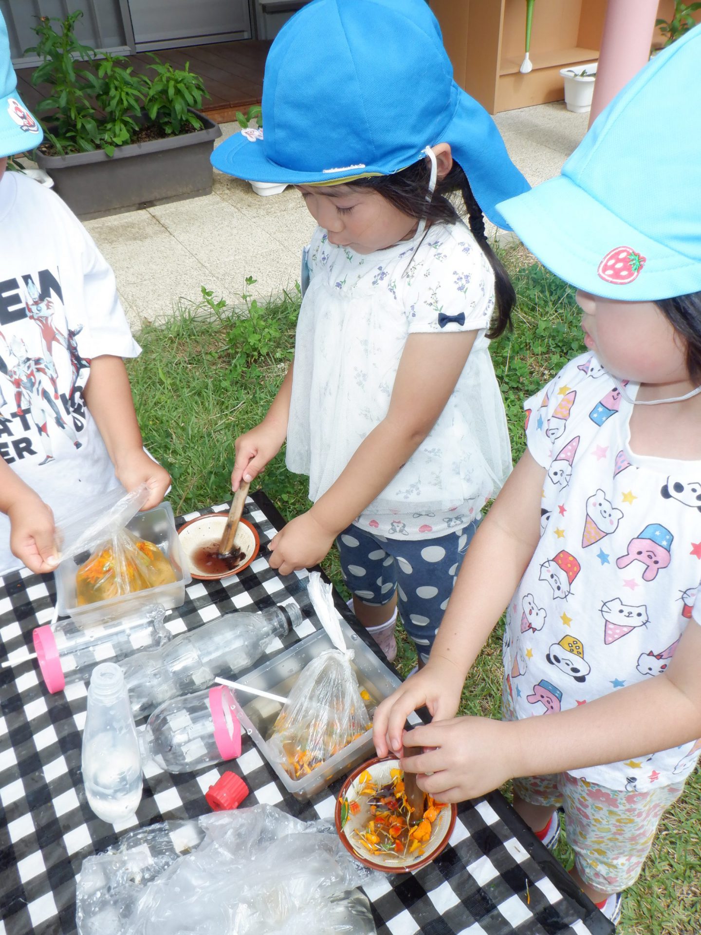 畑に咲いたマリーゴールドや赤じそなどを使って 色水づくりが始まりました。