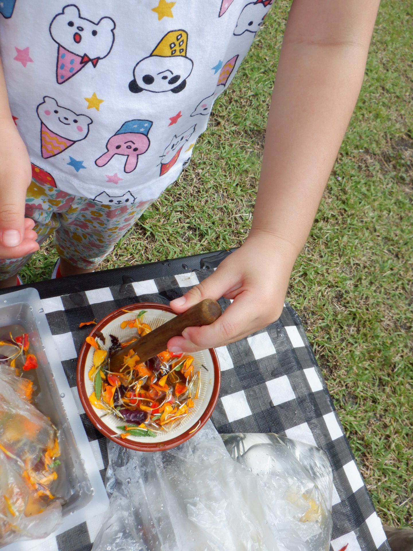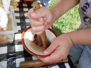 年中さんはすり鉢でつぶして色水を作っていました。