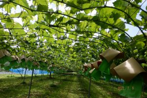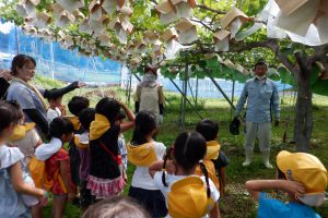 「白い紙がかけてあるのは紫色のブドウができるんだよ。茶色の紙がかけてあるのがシャインマスカットだよ。」