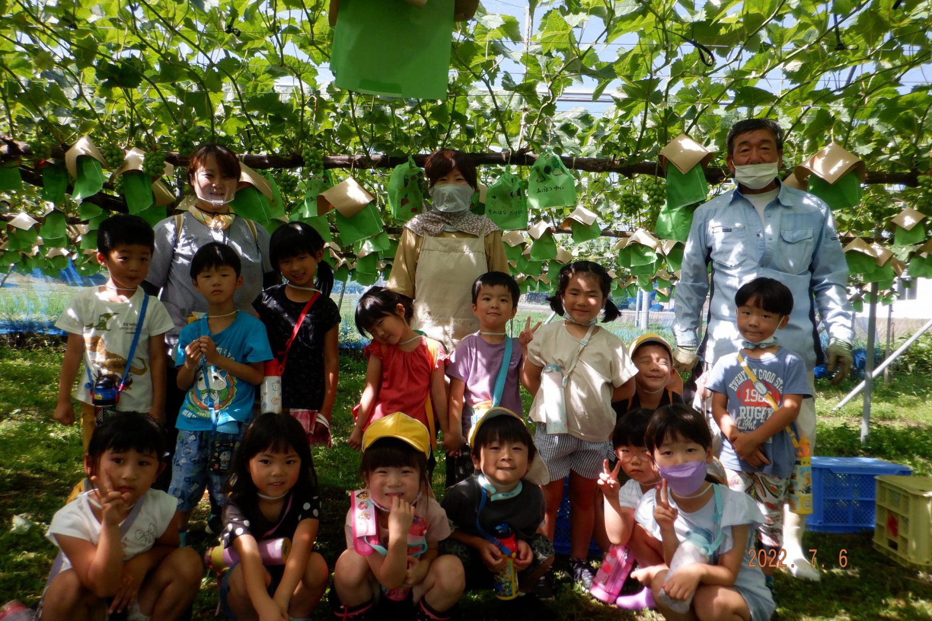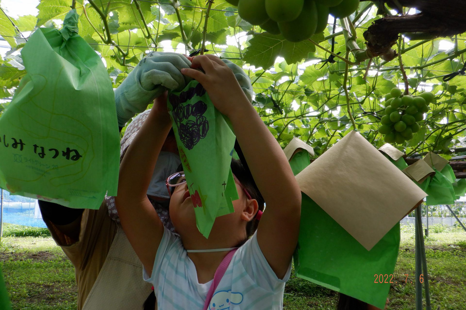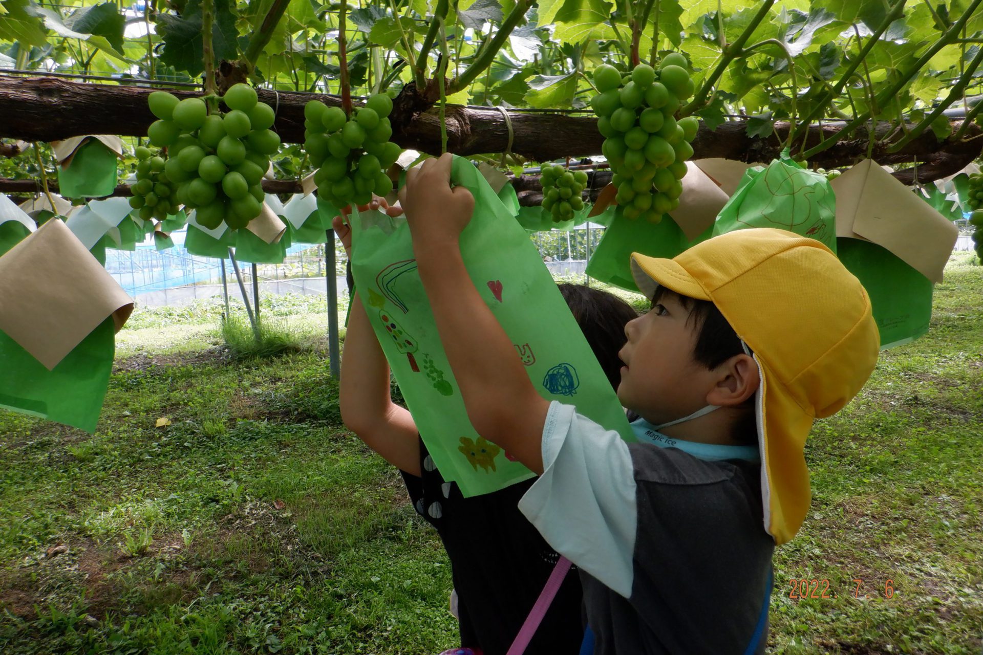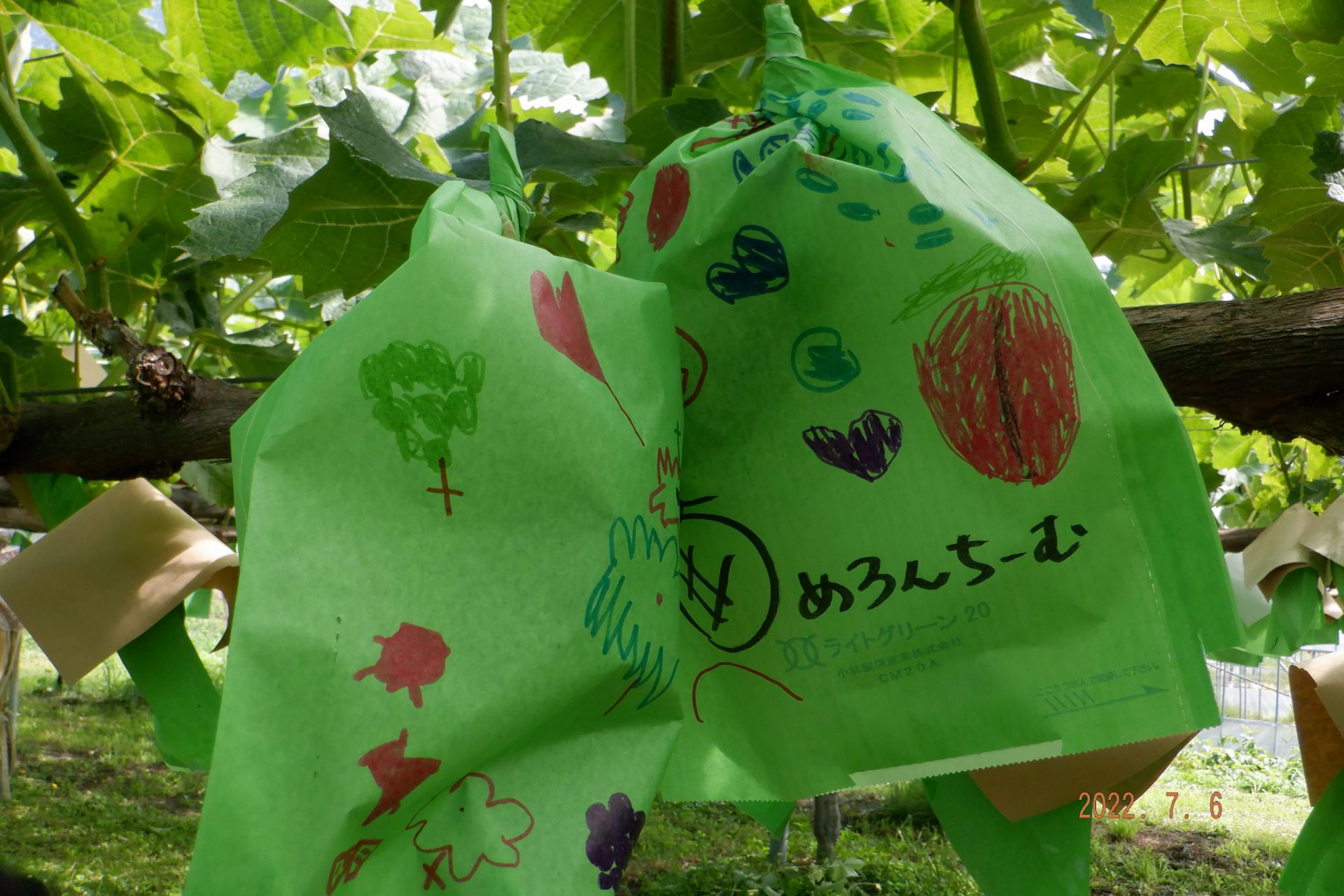 ・自分の絵が描いてある袋がかかっているので、ブドウの生長を楽しみにする気持ちがより膨らんでいるようです。収穫するときまでの間に何度か通いながら、ブドウの生長や変化を楽しみにできるようにしていきたいと思います‼