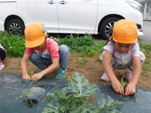 6月みんなで、今年は畑に何を植えようか相談し「スイカを食べたい!育てたい!」と苗を植えました。