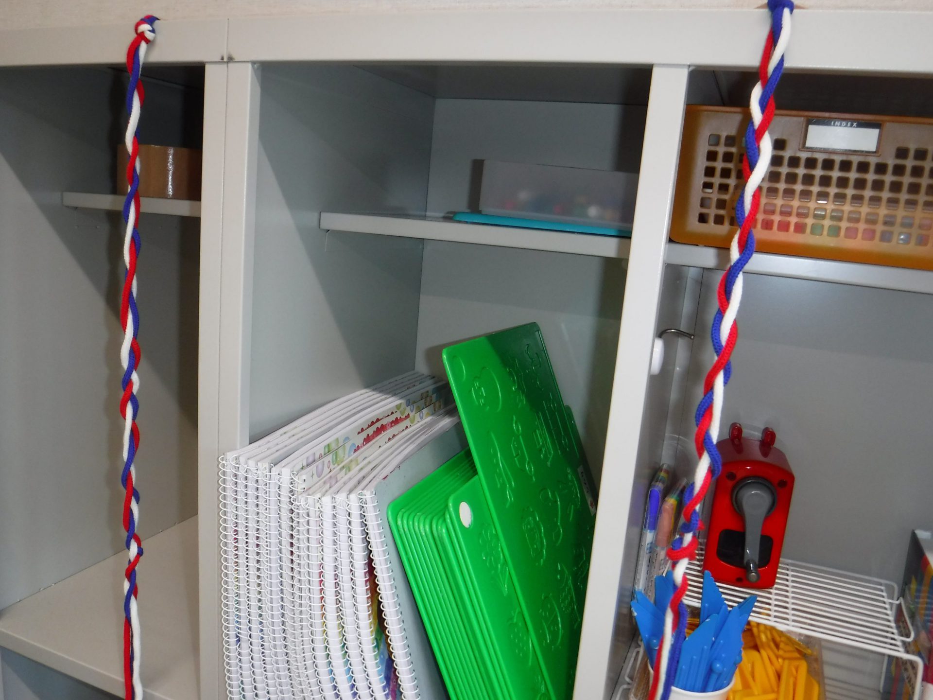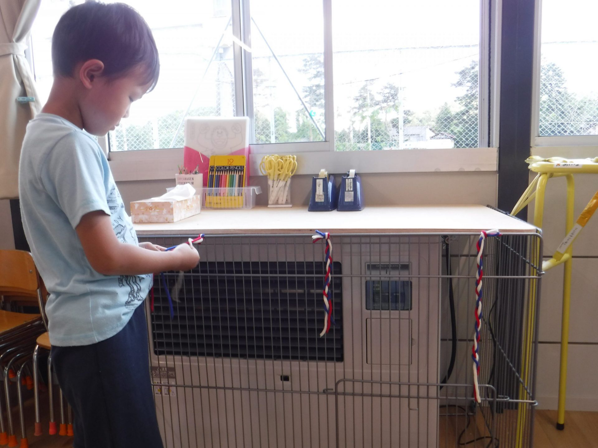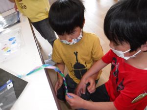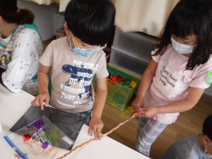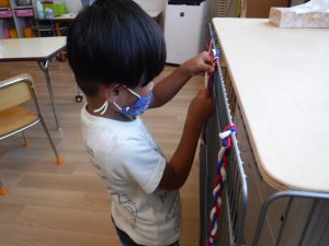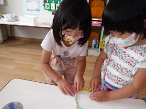 すずらんテープだとさけてしまい、うまくできず苦戦していたので、三色の紐を用意してあげると、