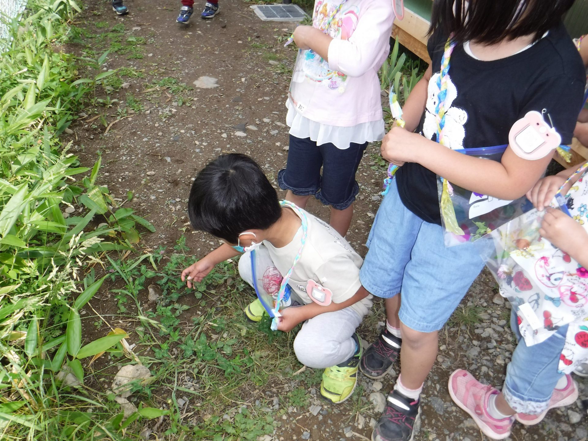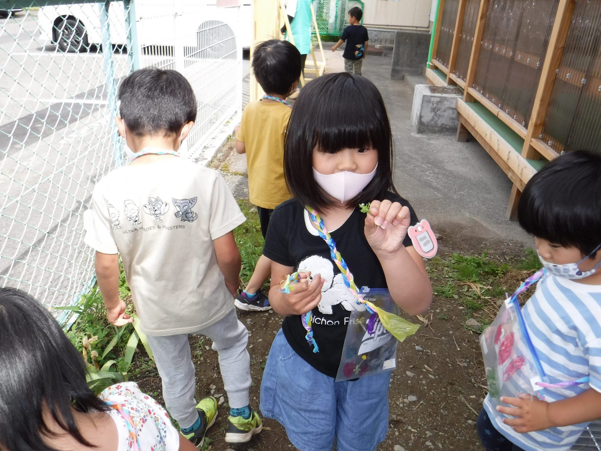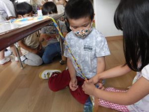 年中さんがいいもの探しをしている間、年長さんは年少さんにバッグを作ってあげていました。