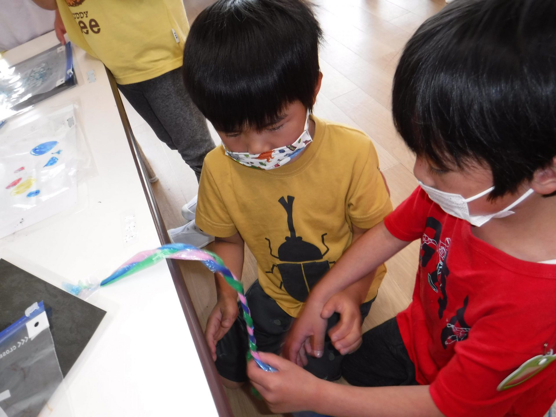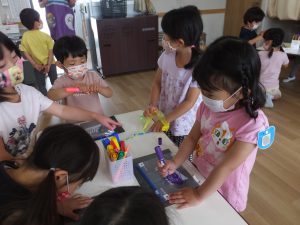 ある日、年長さんが「一緒にバッグ作らない?」「教えてあげる」と年中さんを誘いに来てくれました。