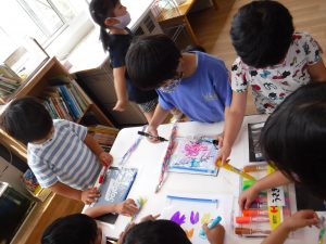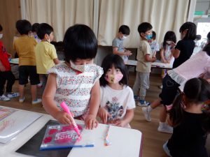 年長さんがマジックペンを貸してくれ袋に絵も描きました。