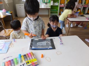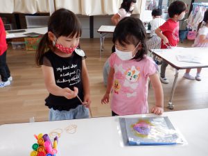 そんな優しく頼れる年長さんが「大好き」な年中さん、年少さん。関わりの中で優しさ、刺激を受け、クラスの活動の中でも、いろいろなことに挑戦したり、やってみたい気持ちが見られます。年長さんが何かやっていると、気になってしょうがない姿もとってもかわいいです。