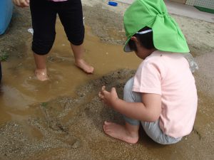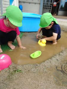 「ふねうくかな?」「さわってみていい?」と泥水に触れたり、玩具を浮かべたりと盛り上がっていました。