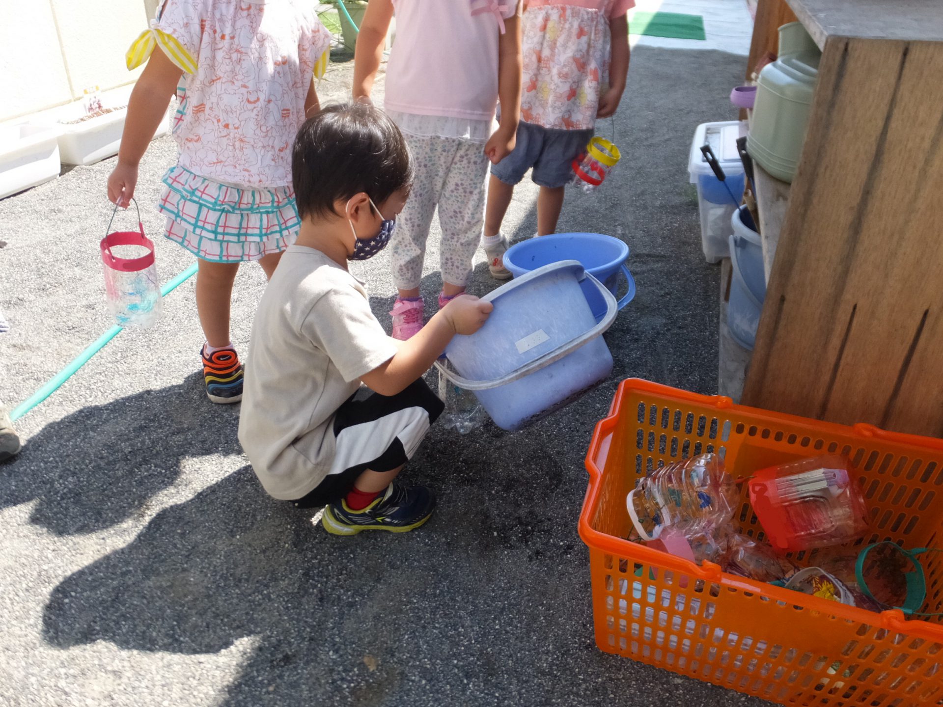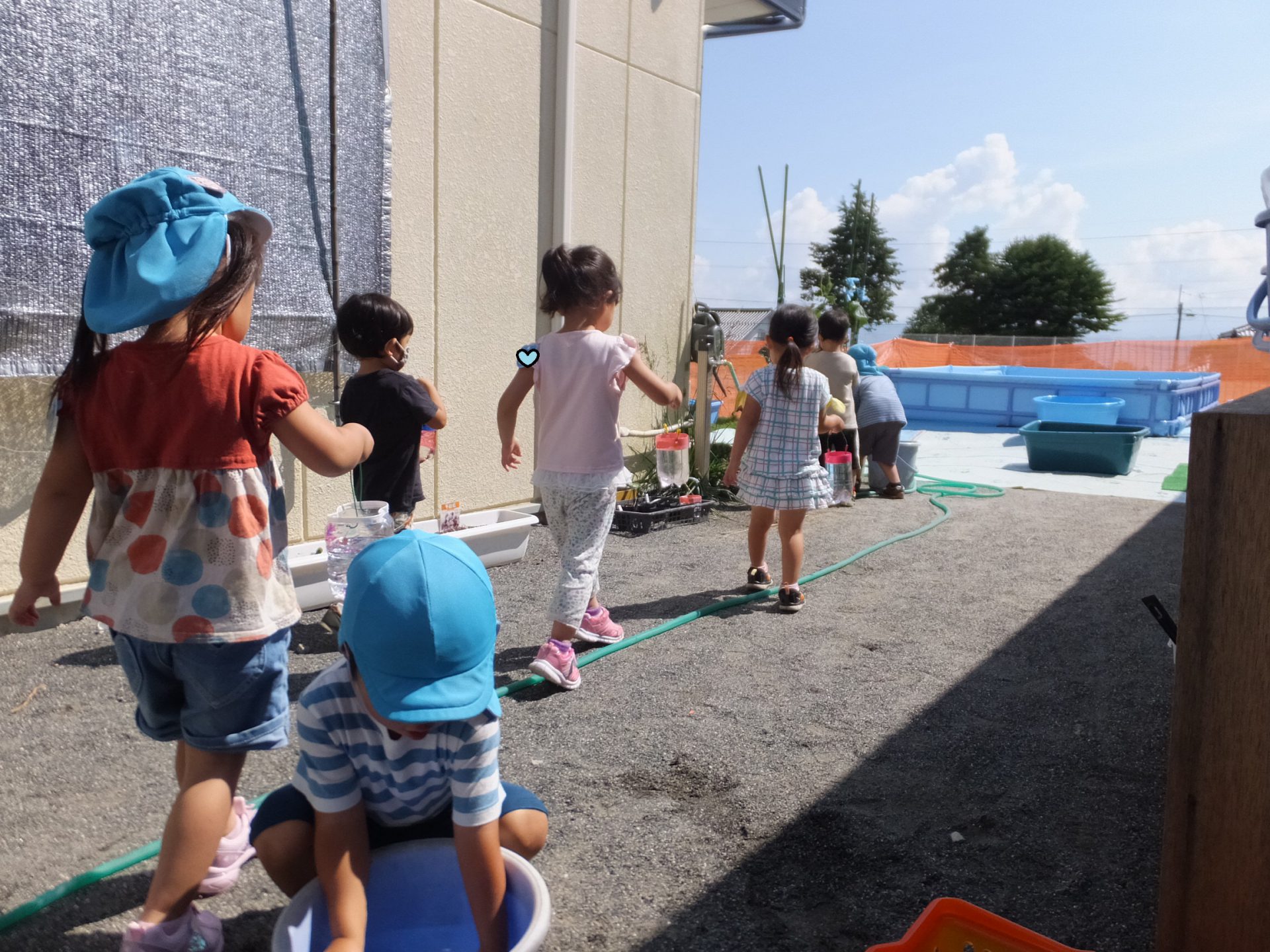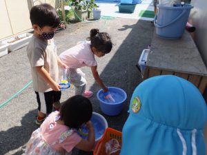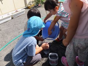 「ちょっとあげる」など自分たちで考え、少ない水を分け合いながら水やりを楽しむ姿がありました。