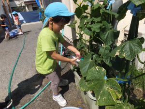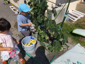 「こっちにもあげようよ」と隣のきゅうりのプランターにも水やりをしてくれて