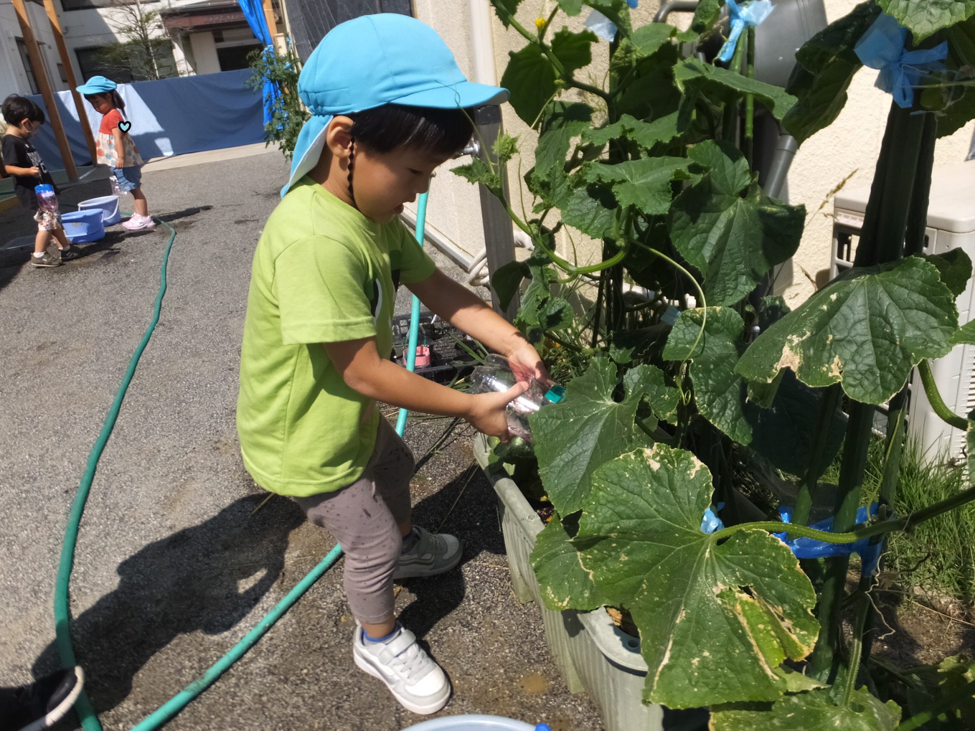 「きゅうりも大きくなあれ」とたくさん水をあげました。