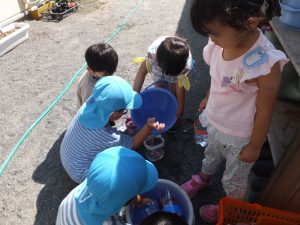 まだまだ自分が中心の3歳児で〝僕が水やりをしたい!〟という気持ちが強い中でも残り少ない水を分けたり、自分ではなく友達のバケツに水を入れてくれる優しい姿が見られ、友達と一緒に生活する中で相手を想う心も育ってきているのだと嬉しく思いました。
