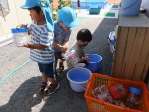 登園してきた子から「お水をあげたい!」と自分のペットボトルバケツを取り出して水を汲み