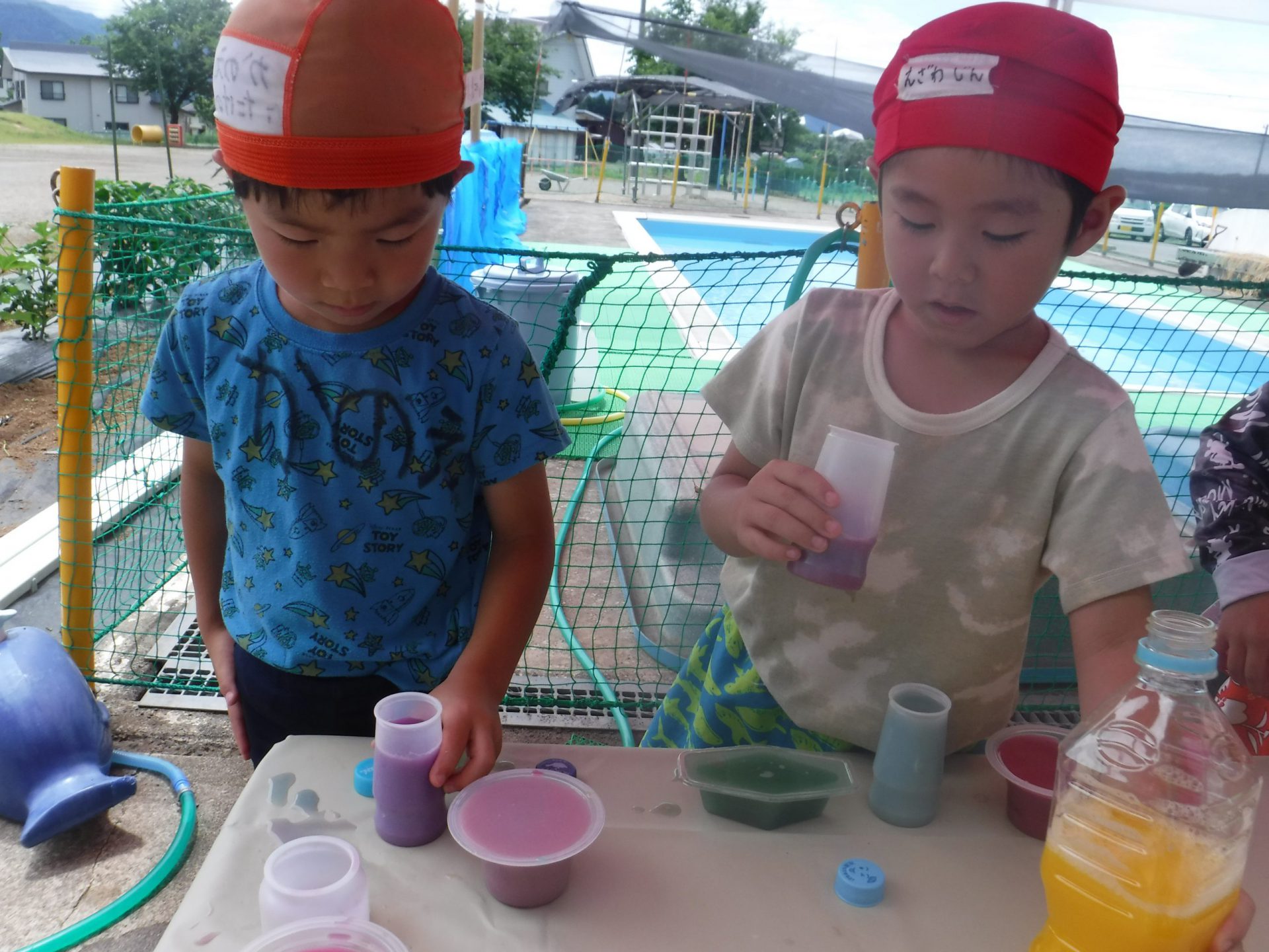 今日は、みんなが5月に植えたお花やバジルを使って、ジュース屋さんごっこ!!