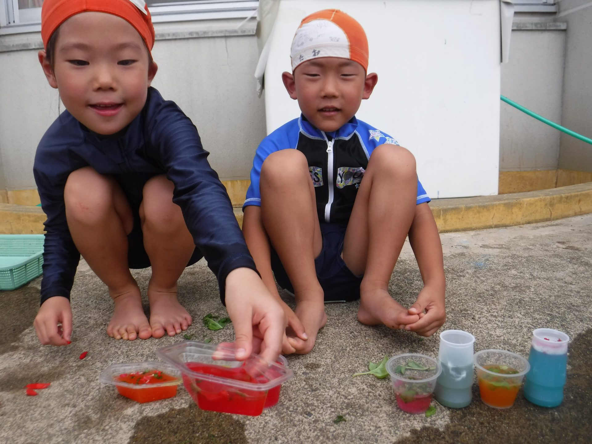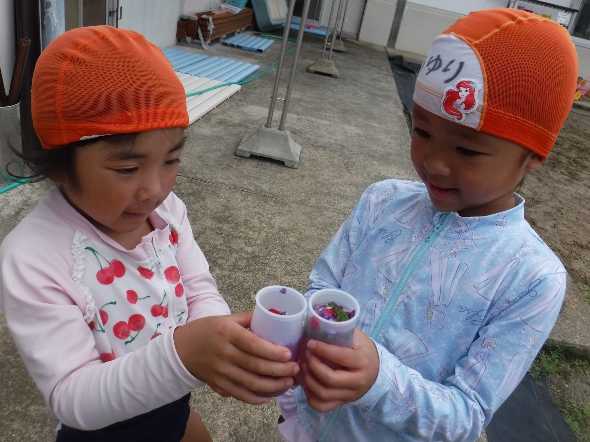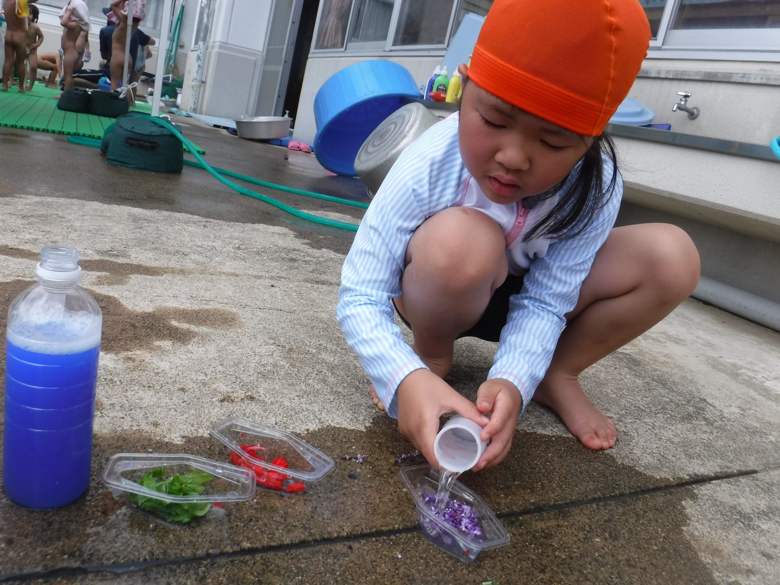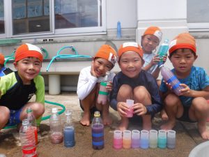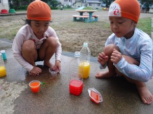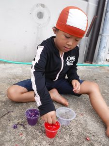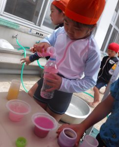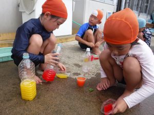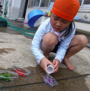 色水に浮かべると、咲いてる時とはまた違ったきれいな見え方があることを発見した子どもたち。