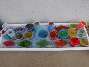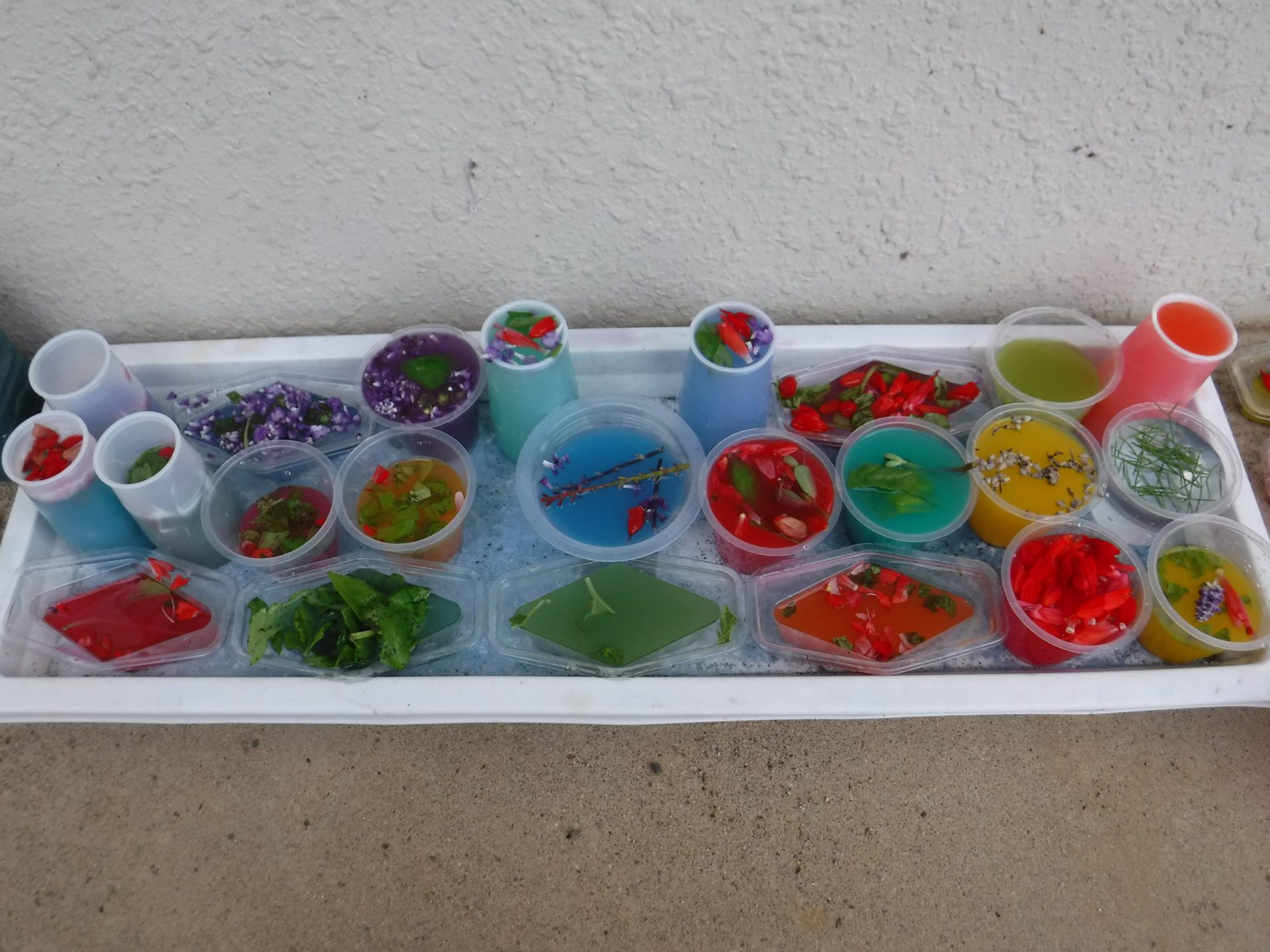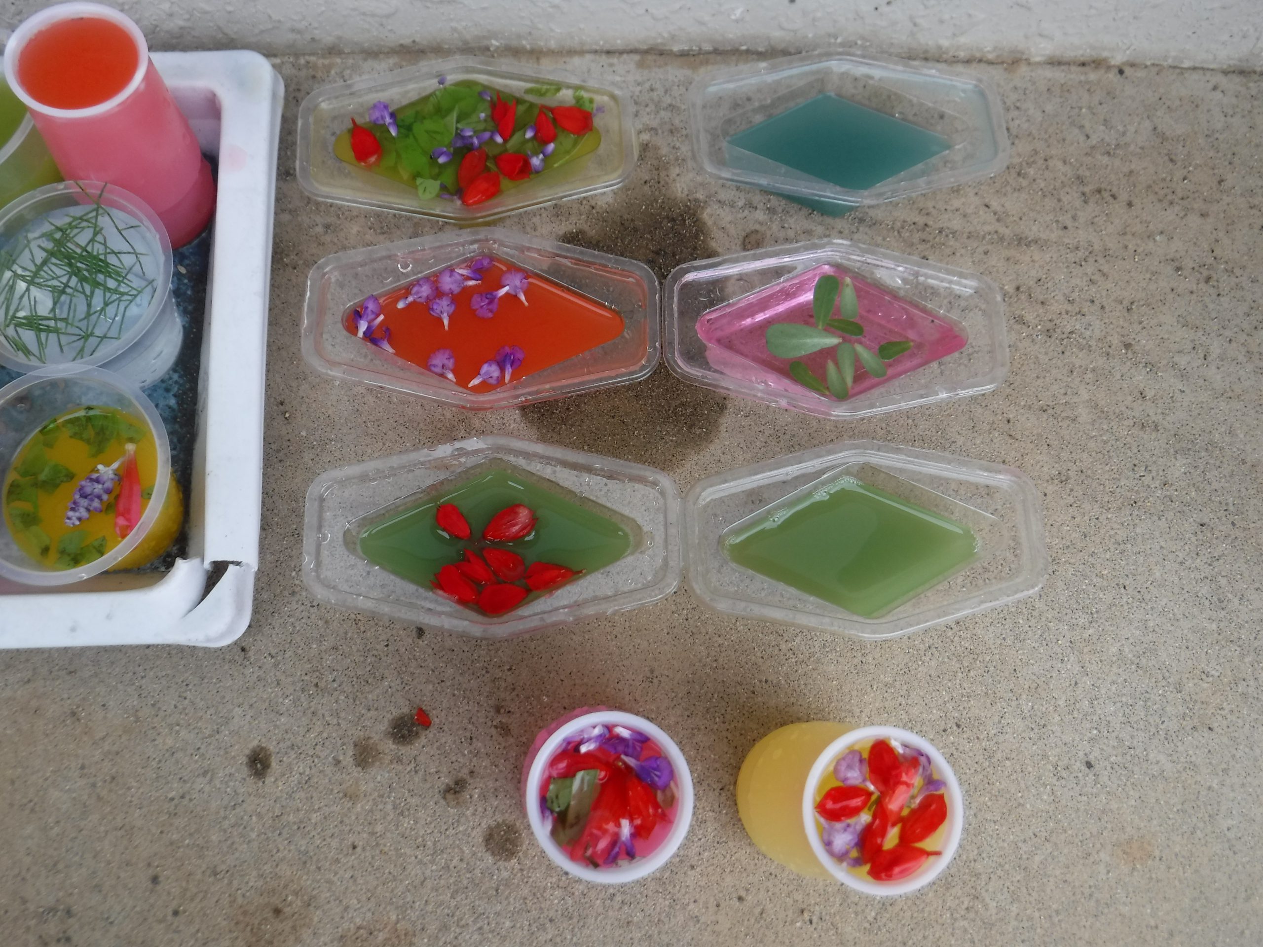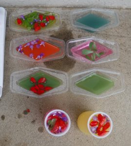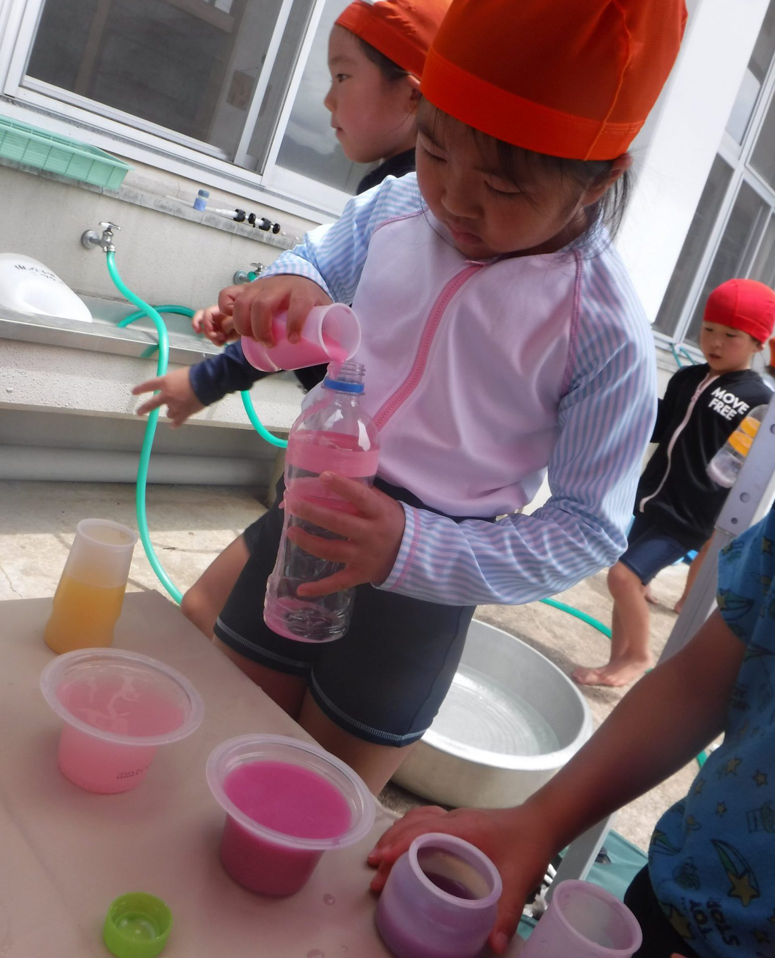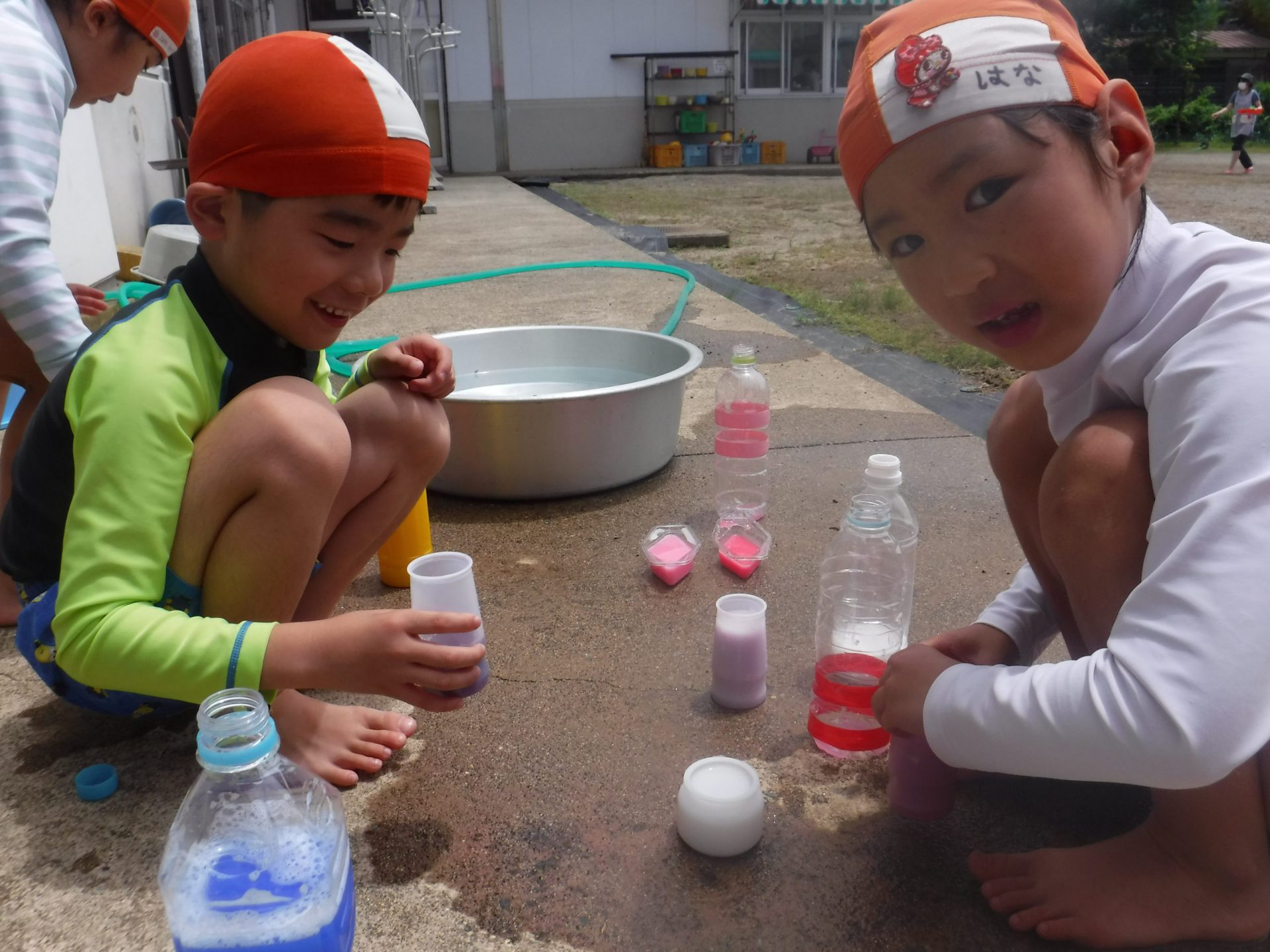 色水に浮かべると、咲いてる時とはまた違ったきれいな見え方があることを発見した子どもたち。