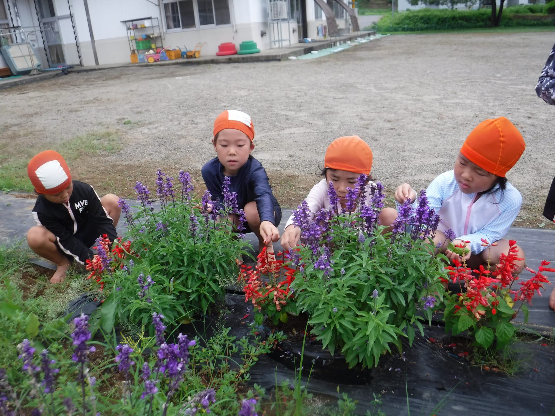 身近な植物に触れながら、お花の名前に興味を持ったり、きれいさに気づいたり、子ども達の感性が光っていました。