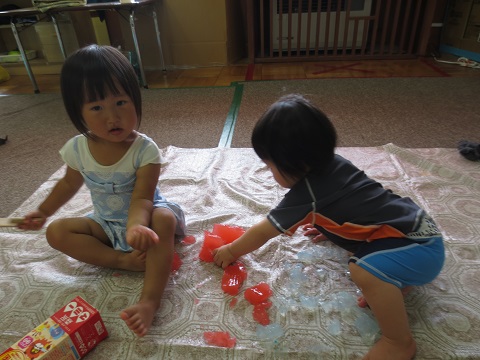 関わり方はそれぞれ違うけど、寒天の感触を感じながらよーく遊んでいました。