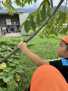 放す場所は・・・カブトムシが安心して木登りができそうな、畑にあるクルミにの木に決定!!優しく、木に放してあげました。
