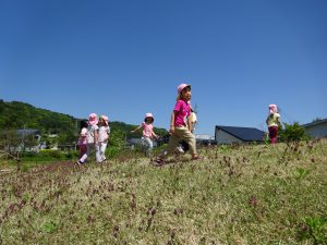 広々とした野原にでかけたり、山の中で山菜探しや探検をしたりと楽しんでいます。
