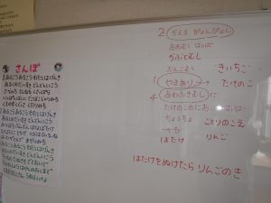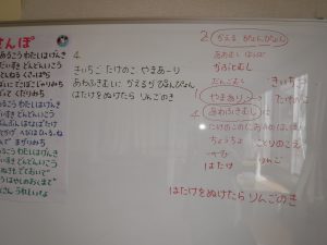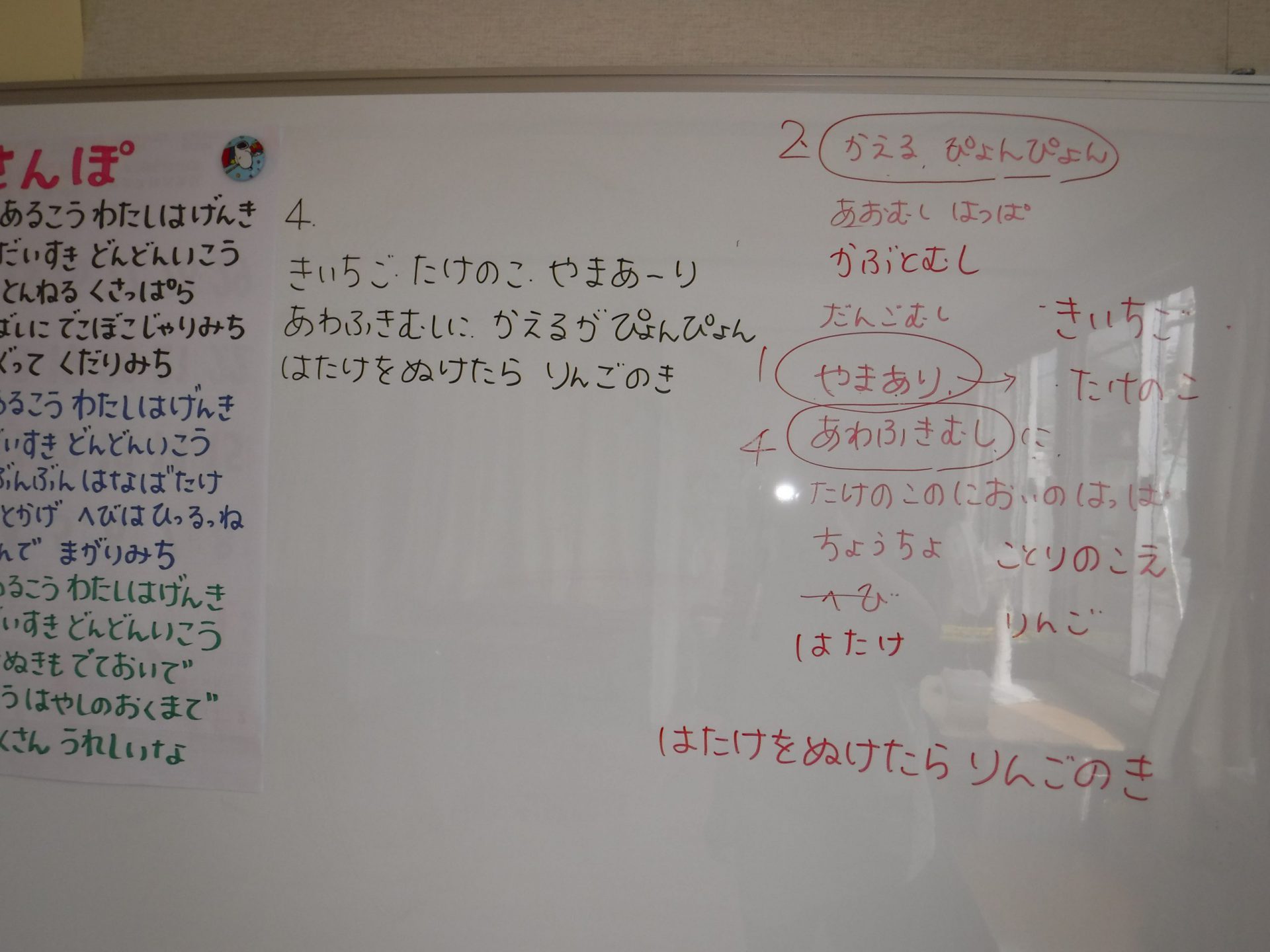 朝の会でさんぽのうたをうたった後、話し合ってみたり、遊んでいる時や給食の時、思いついた言葉をホワイトボードに書いていきました。