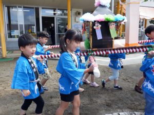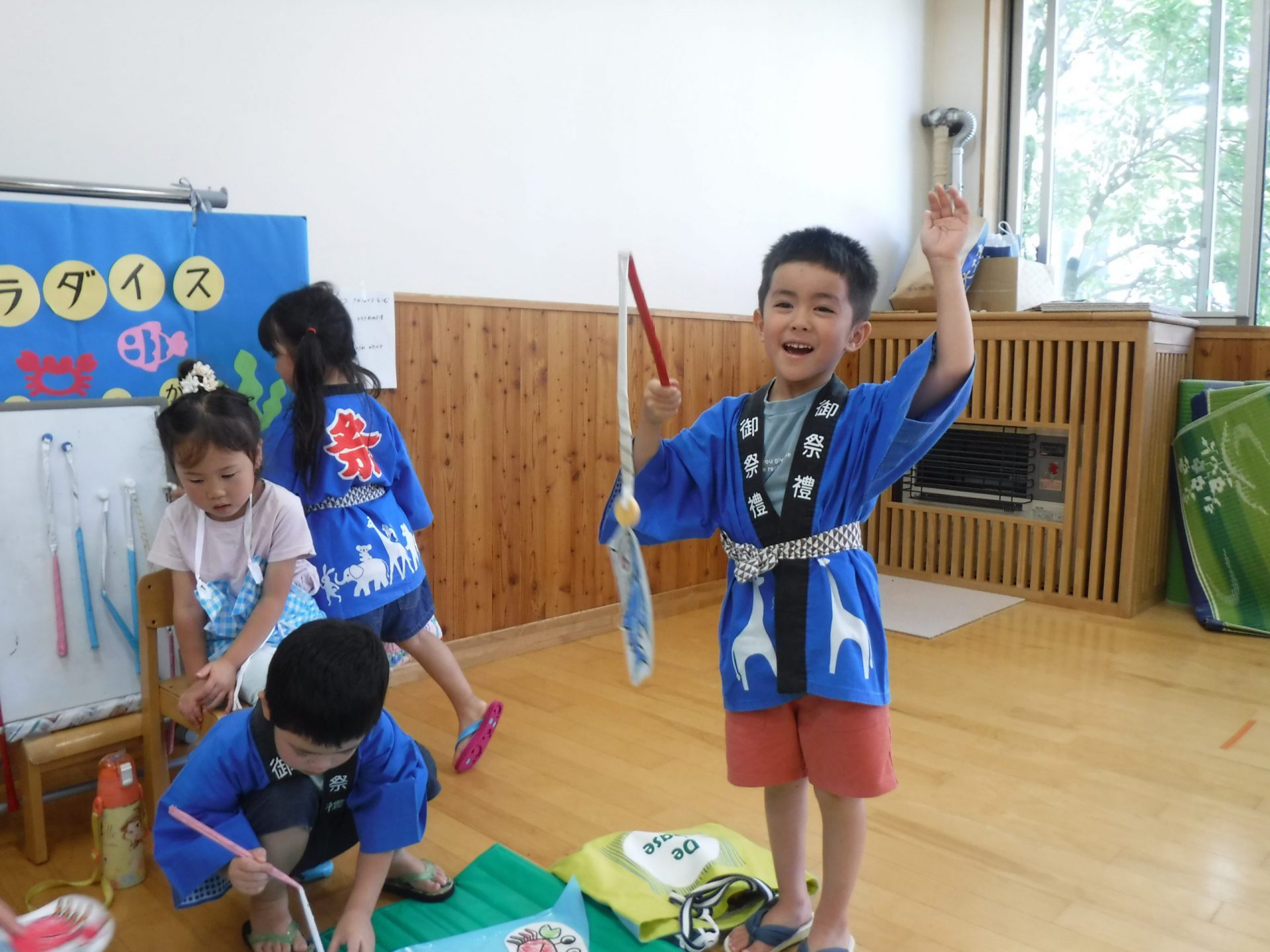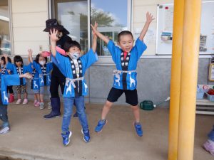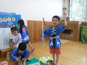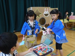 年少・年中児も提灯を作って飾ったり、年長児の準備をのぞいたりするうちに夏祭りを楽しみにしていました。法被を着て気分は夏祭り。お客さんになってたくさん盛り上げてくれました。