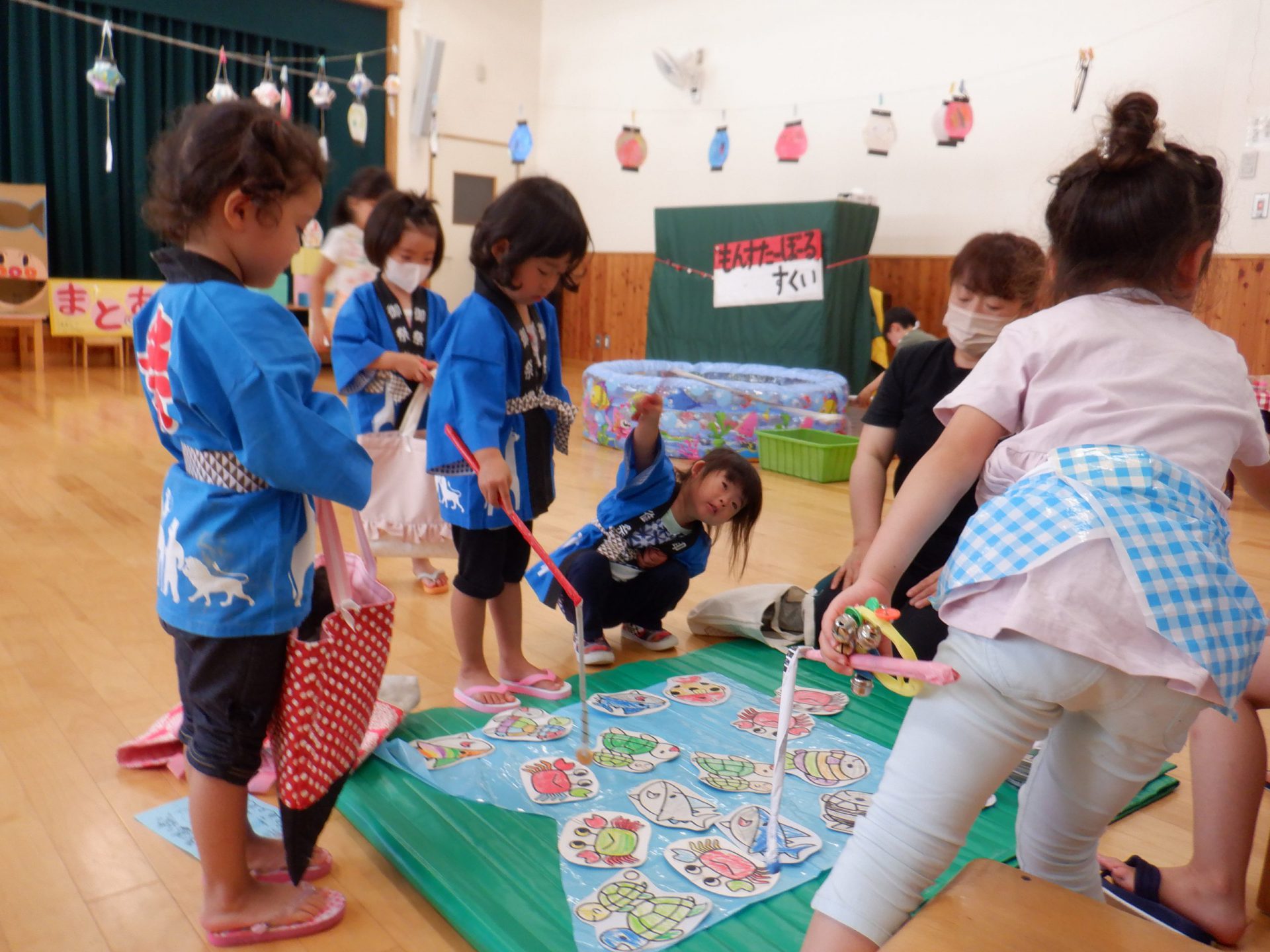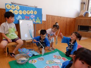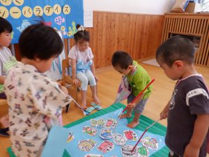 コロナやいろいろな感染症も出てくる中、密にならない工夫をして、うちわ作りは順番待ちの時間に各クラスで作る。ヨーヨー釣りは、お迎えの時にお家の方と釣って帰る。など、コーナーを減らし、少人数制、時間短縮を実現しました。