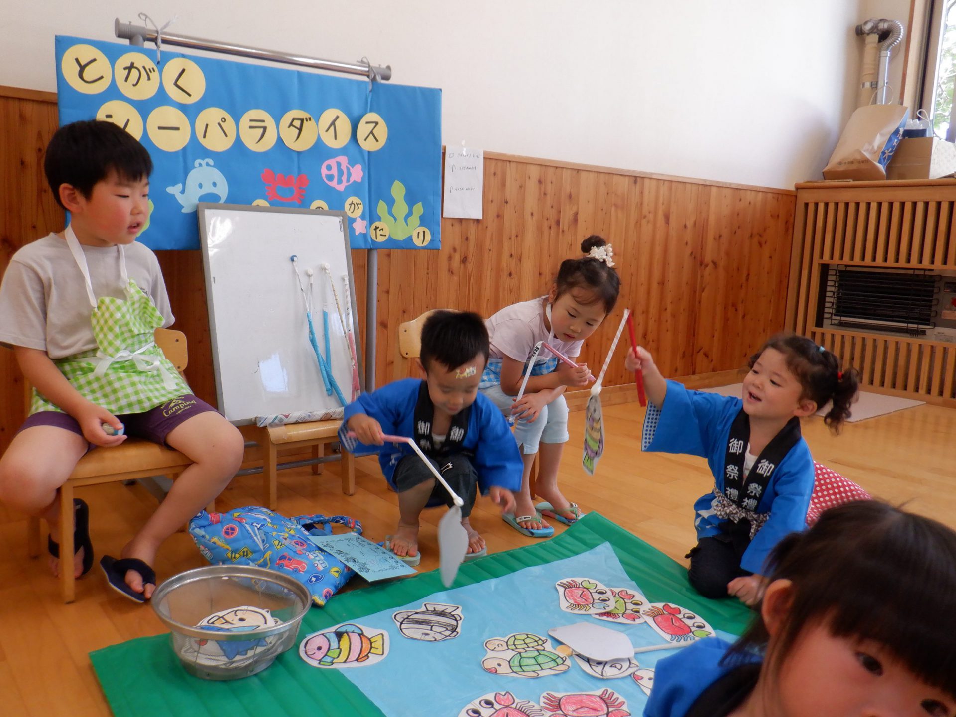 どんぐり組(3歳児)のお客さんに年長のお店屋さんは説明したり、見守ったりと大活躍。お客さんも、慎重に魚を釣り上げ、大喜びです。