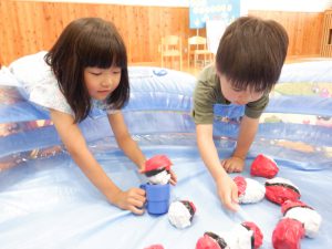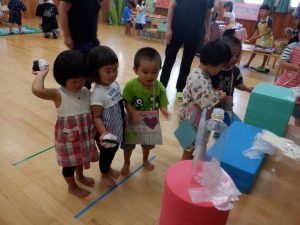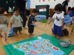りす組(2歳児)のお友だちも、的当て、魚釣りに挑戦しています。