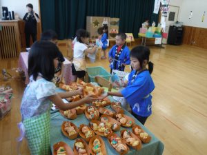 「いらっしゃいませ~」「タコ焼きください」「はい、こちらです」のやり取りは、役になりきって楽しみました。