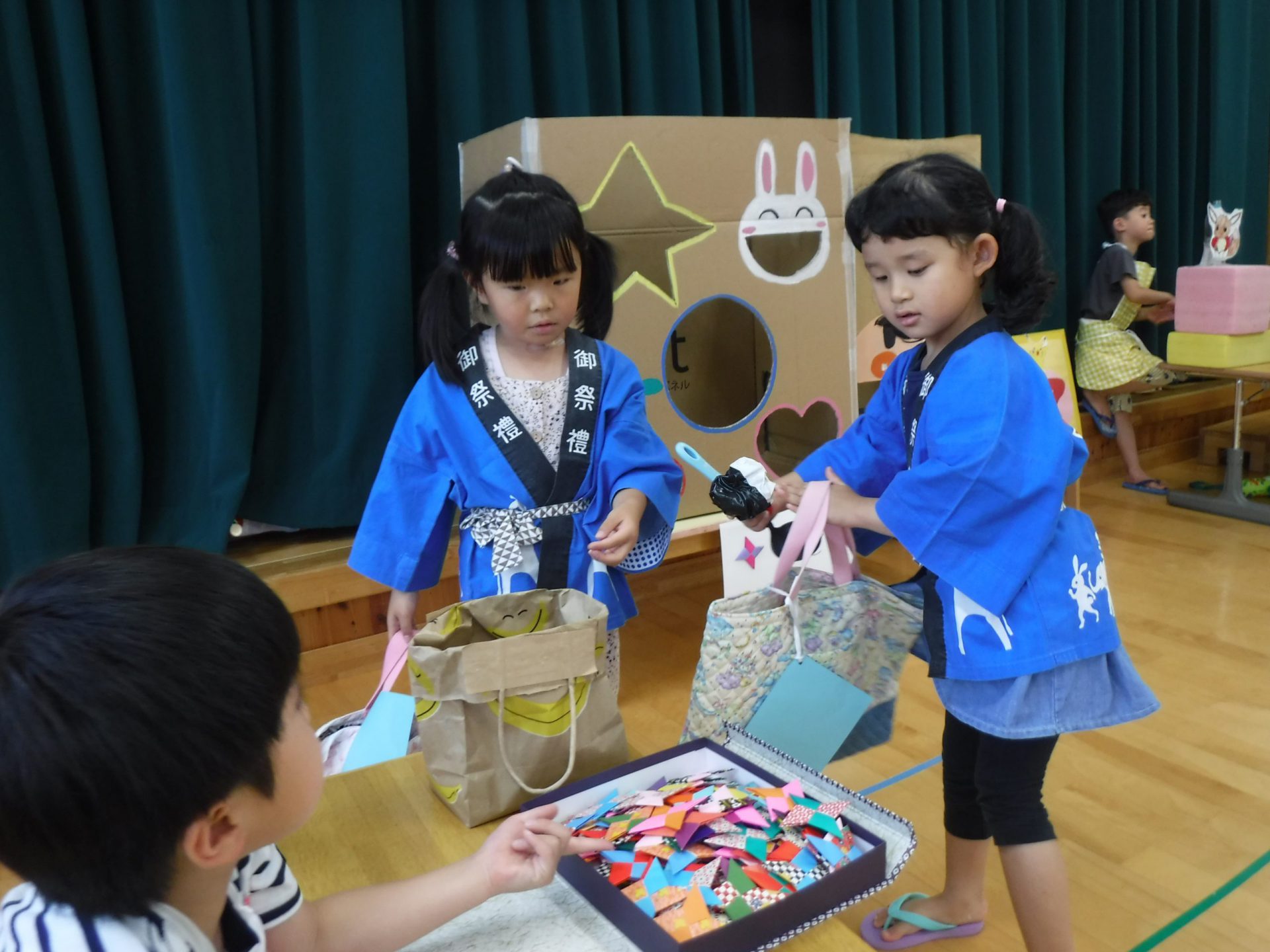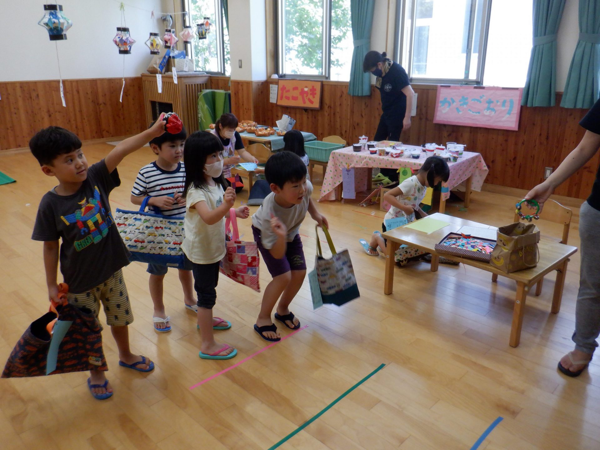 準備段階から話し合いを大切にしてきた年長児。アイデアを出しても作り出したら思うようにいかなかったり、疲れてしまったりすることがありましたが、各担当を皆で手伝ったり手伝ってもらったりする中で準備ができました。